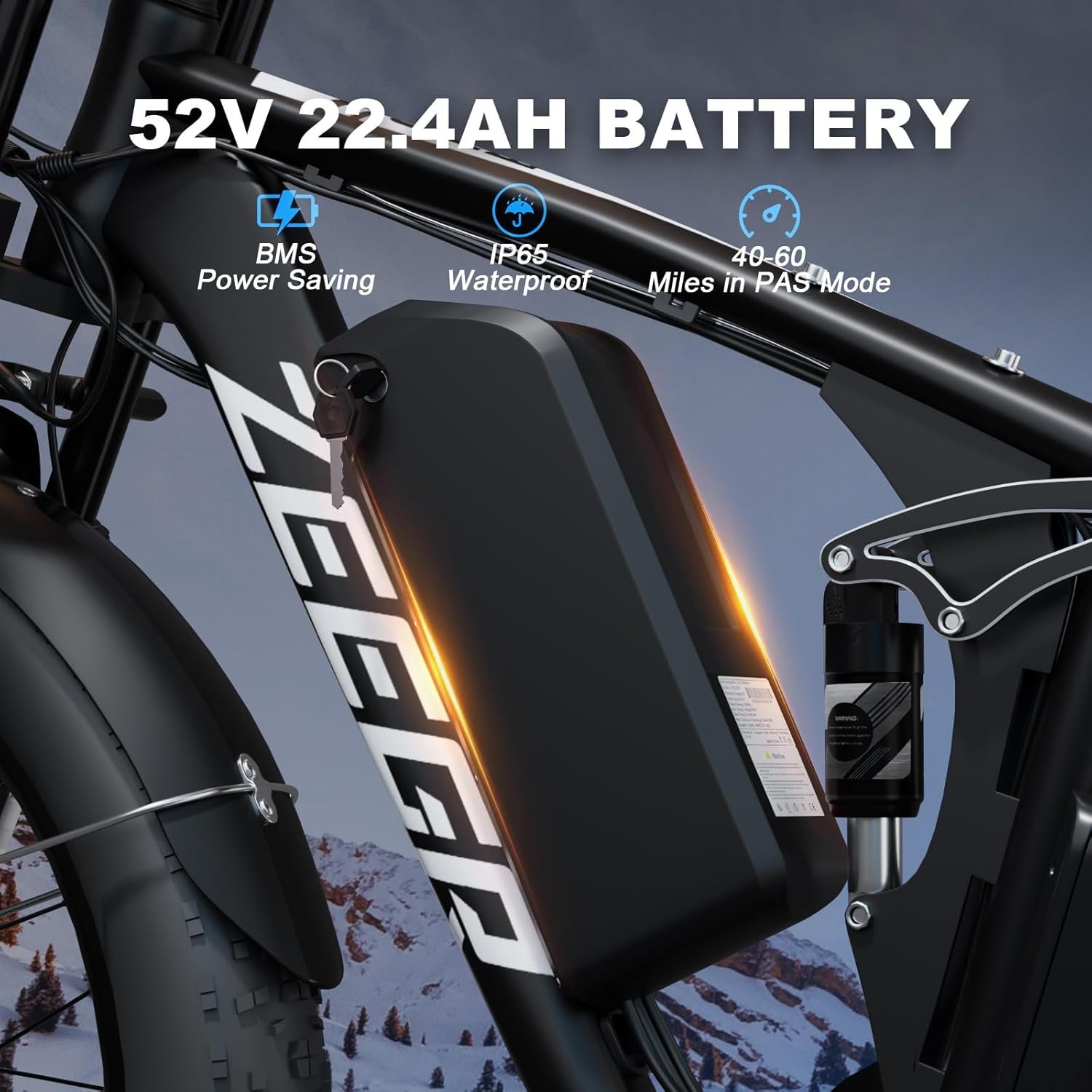 Dual Motor Electric Bikes for Adults: TWO 52V 1000W high speed brushless motors provide electric bicycles with stronger power and climbing ability, helps to reach the top speed of 35MPH with ease. Removable large capacity 52V 22.4Ah battery offers a long riding range up to 40-60 miles in pedal assist mode. Upgraded charger completes charging quickly in 5-8 hours