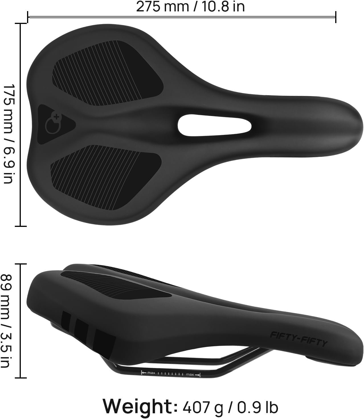 FIFTY-FIFTY Comfortable and Sturdy Bike Saddle Made of special gel and memory foam, soft and comfortable Ergonomic design provides adequate support Waterproof surface and good stitching Air ventilation design reduce sweating and make you feel cooler Compatible with MTB, Road Bike, E-Bike, E-MTB Air Ventilation Airflow vents accelerate airflow and heat dissipation to reduce sweating and keep you dry Non-slip Design Non-slip design can help you keep sitting on the right position Adjustable Rails The rails of the MTB saddle have graduated markings that make it easy to adjust front and rear Super Lightweight The bicycle seat can reduce the weight of your bike and improve riding performance