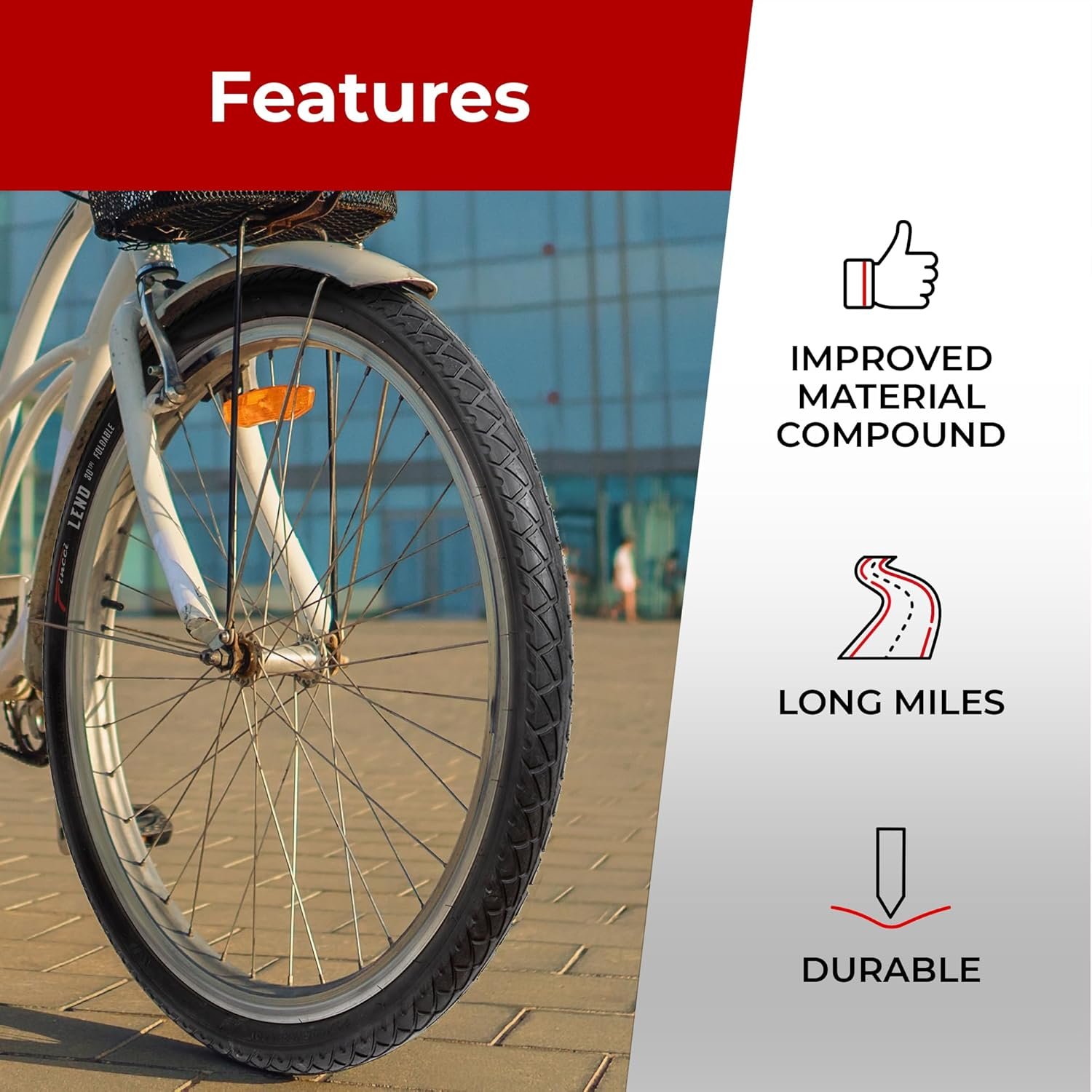 Fast Rolling high traction tread for faster and more comfortable ride – Also, provides good grip on uneven surfaces like tarmac roads or pavement.