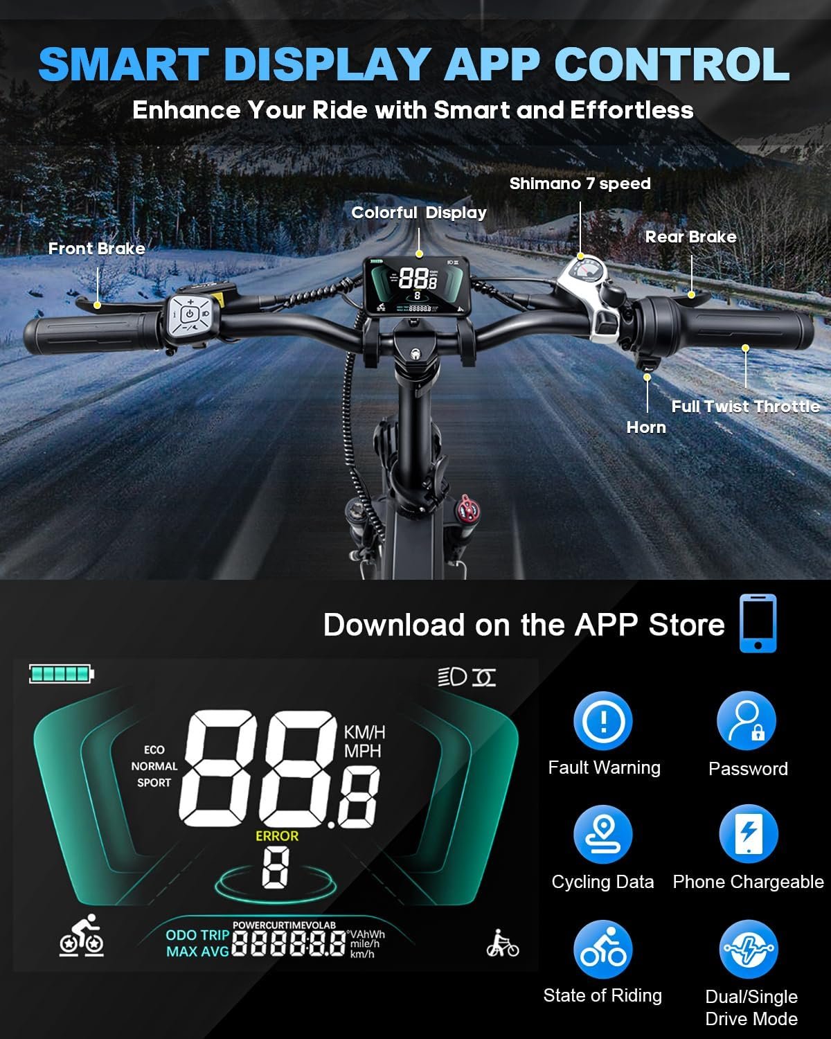 【𝐒𝐦𝐚𝐫𝐭 𝐋𝐂𝐃 𝐃𝐢𝐬𝐩𝐥𝐚𝐲 & 𝐀𝐩𝐩 𝐂𝐨𝐧𝐭𝐫𝐨𝐥】Mobile phone chargeable. This dual motor ebike features a full-color screen with USB port that lets you easily monitor key information such as battery level, distance traveled, speed, and riding mode. Mobile app compatibility enhances your riding experience. Five Riding Modes: Switch between Throttle, Pedal Assist, Walking Modes, and Single/Dual Drive Modes to effortlessly switch between long-distance travel and exercise.