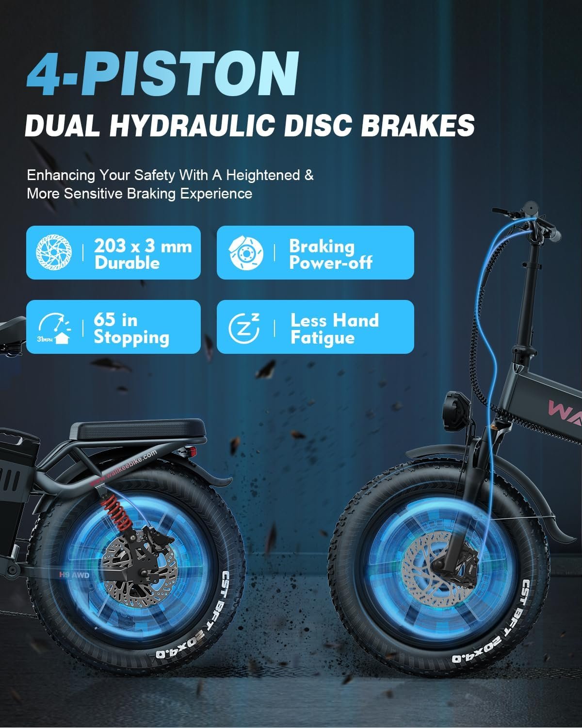 【𝐅𝐮𝐥𝐥 𝐒𝐮𝐬𝐩𝐞𝐧𝐬𝐢𝐨𝐧 & 𝟒-𝐏𝐢𝐬𝐭𝐨𝐧 𝐃𝐮𝐚𝐥 𝐇𝐲𝐝𝐫𝐚𝐮𝐥𝐢𝐜 𝐃𝐢𝐬𝐜 𝐁𝐫𝐚𝐤𝐞𝐬】Our H9AWD electric bike is equipped with a lockable hydraulic suspension and an aluminum rear shock absorber, designed to effectively absorb shocks and smooth out bumps for a more comfortable ride. Combined with 4-piston 203mm hydraulic disc brakes, this bike provides powerful and reliable stopping power. Together, they deliver a safer and more comfortable ride.