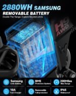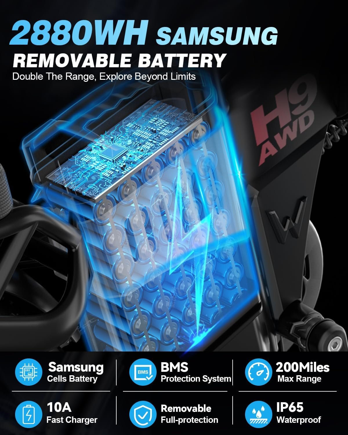 【𝟒𝟖𝐕 𝟔𝟎𝐀𝐡 𝐔𝐥𝐭𝐫𝐚 𝐋𝐨𝐧𝐠 𝐑𝐚𝐧𝐠𝐞 𝐁𝐢𝐤𝐞】The H9 AWD foldable electric bike features a 48V 60Ah lithium-ion battery for exploring freely without worry. With pedal assist, you can enjoy a range of 120-200 miles on a full charge, depending on riding mode, load, weather, and road conditions. The waterproof, removable battery has a lock for easy detachment and secure charging, protecting against theft and rain.
