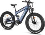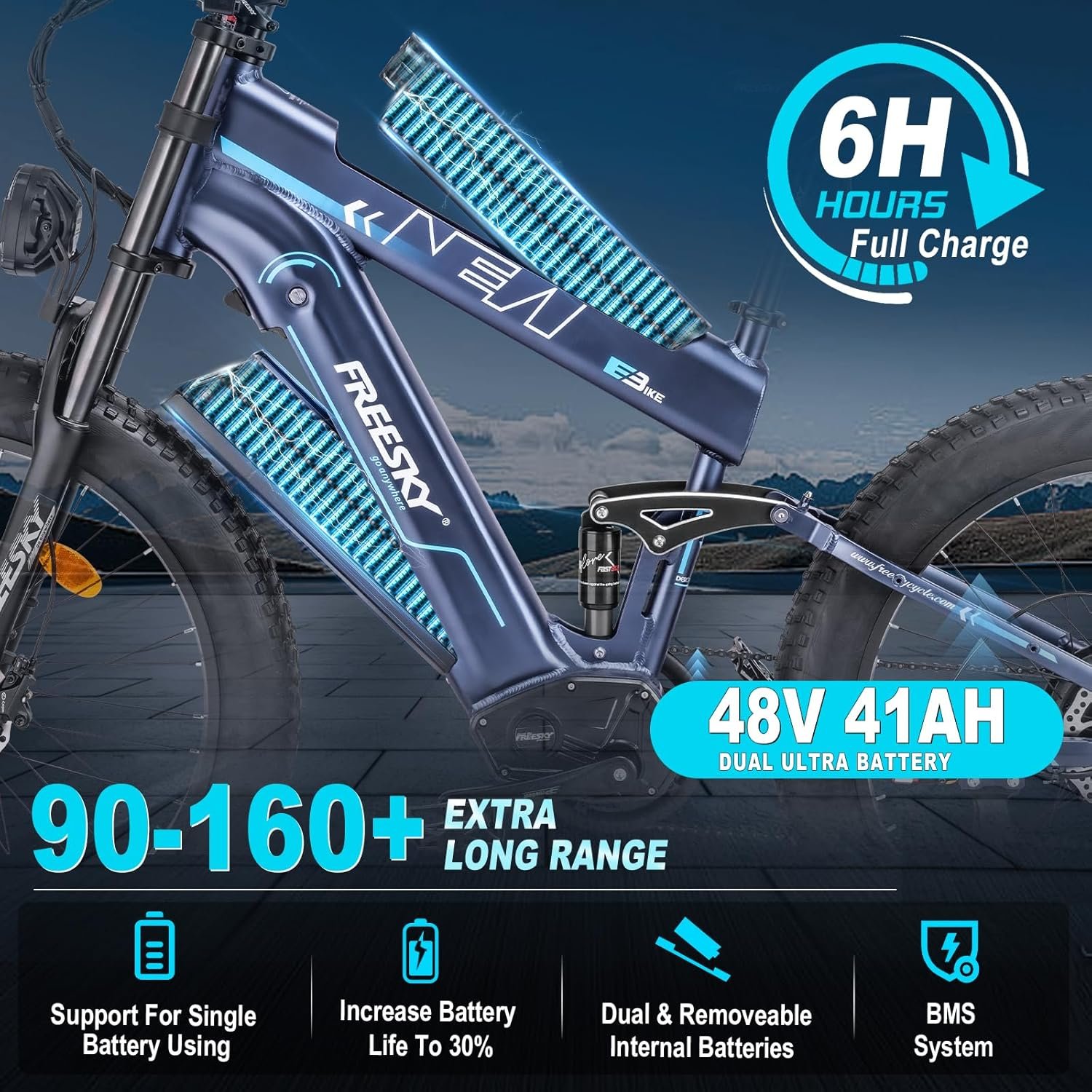 【𝐁𝐄𝐒𝐓 𝐃𝐔𝐀𝐋 𝐁𝐀𝐓𝐓𝐄𝐑𝐘 𝐄𝐁𝐈𝐊𝐄 𝐔𝐍𝐃𝐄𝐑 $𝟐𝟎𝟎𝟎】Featuring Full Suspension and DUAL HYDRAULIC DISC BRAKES: Equipped with 2 removable batteries and 26″X4″ fat tires, providing outstanding shock absorption performance. Combined with front and rear hydraulic 4-pistons disc brakes and the powerful motor system, you can enjoy a comfortable riding experience and powerful braking even on steep slopes, rugged terrain, or other extreme terrains.