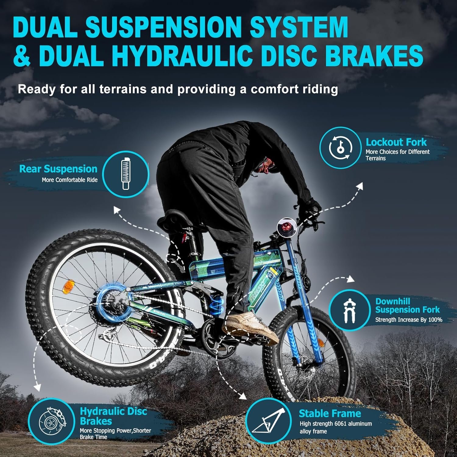 【𝐁𝐄𝐒𝐓 𝐃𝐔𝐀𝐋 𝐁𝐀𝐓𝐓𝐄𝐑𝐘 𝐄𝐁𝐈𝐊𝐄 𝐔𝐍𝐃𝐄𝐑 $𝟐𝟎𝟎𝟎】 ✔ Dual Removable Batteries – Double your range with 2 hot-swappable packs (18Ah + 23Ah). ✔ Full Suspension System – Lockable hydraulic fork + rear shock absorb bumps for buttery-smooth rides. ✔ 4-Piston Hydraulic Disc Brakes – Stop instantly on steep hills or rough trails—rain or shine. ✔ 26″x4″ Fat Tires – Grip sand, snow, mud, and rocks with confidence. ✔ Peak 2500W Powerhouse Motor – Hit 38MPH (pedal assist).