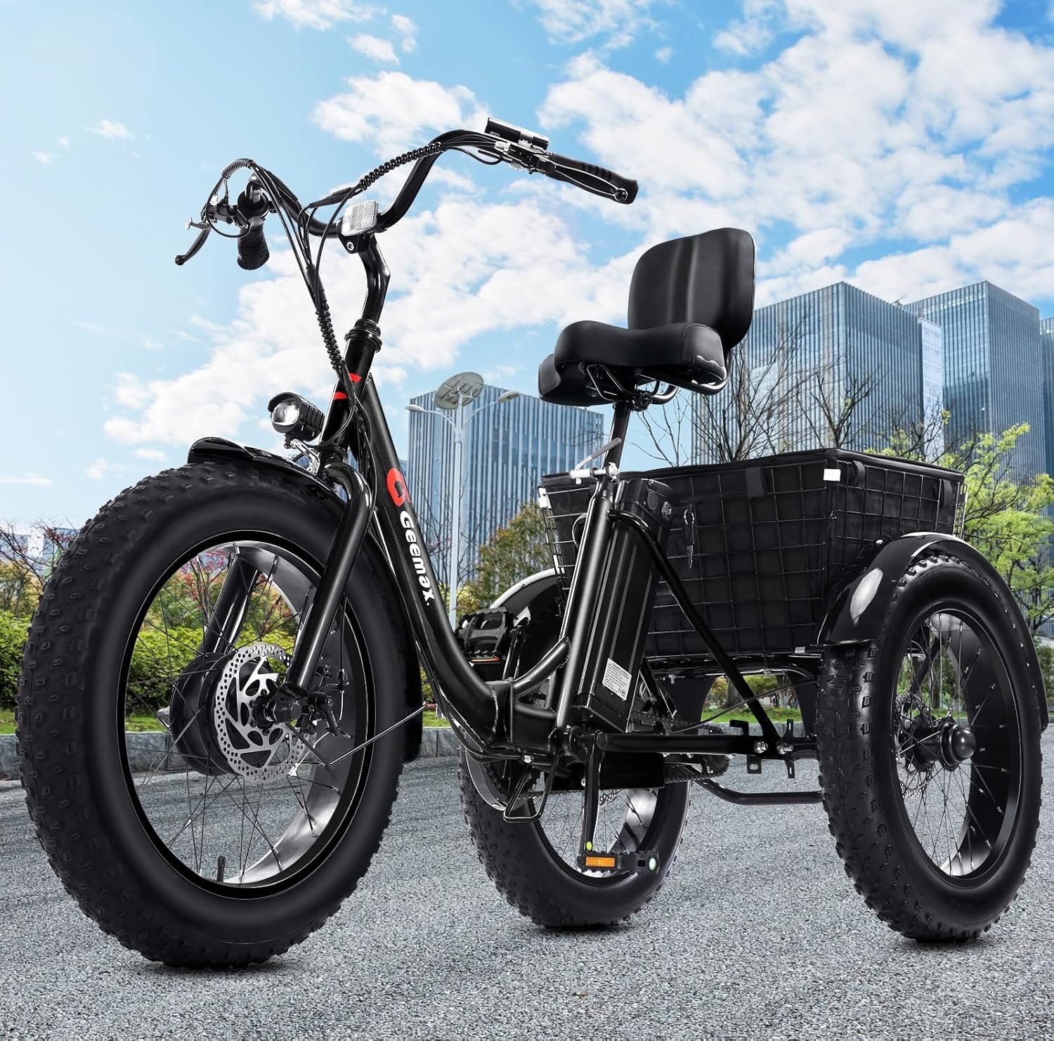 👍 【STRONG FAT TIRE MOUNTAIN BIKE】 Geemax 3 wheel electric bicycle with 4″ wide puncture resistant fat tires, provide you with excellent traction. You can easily ride over beach, snow, gravel, rain, dirt, sand and even ice and enjoy the ultimate e-bike adventure.