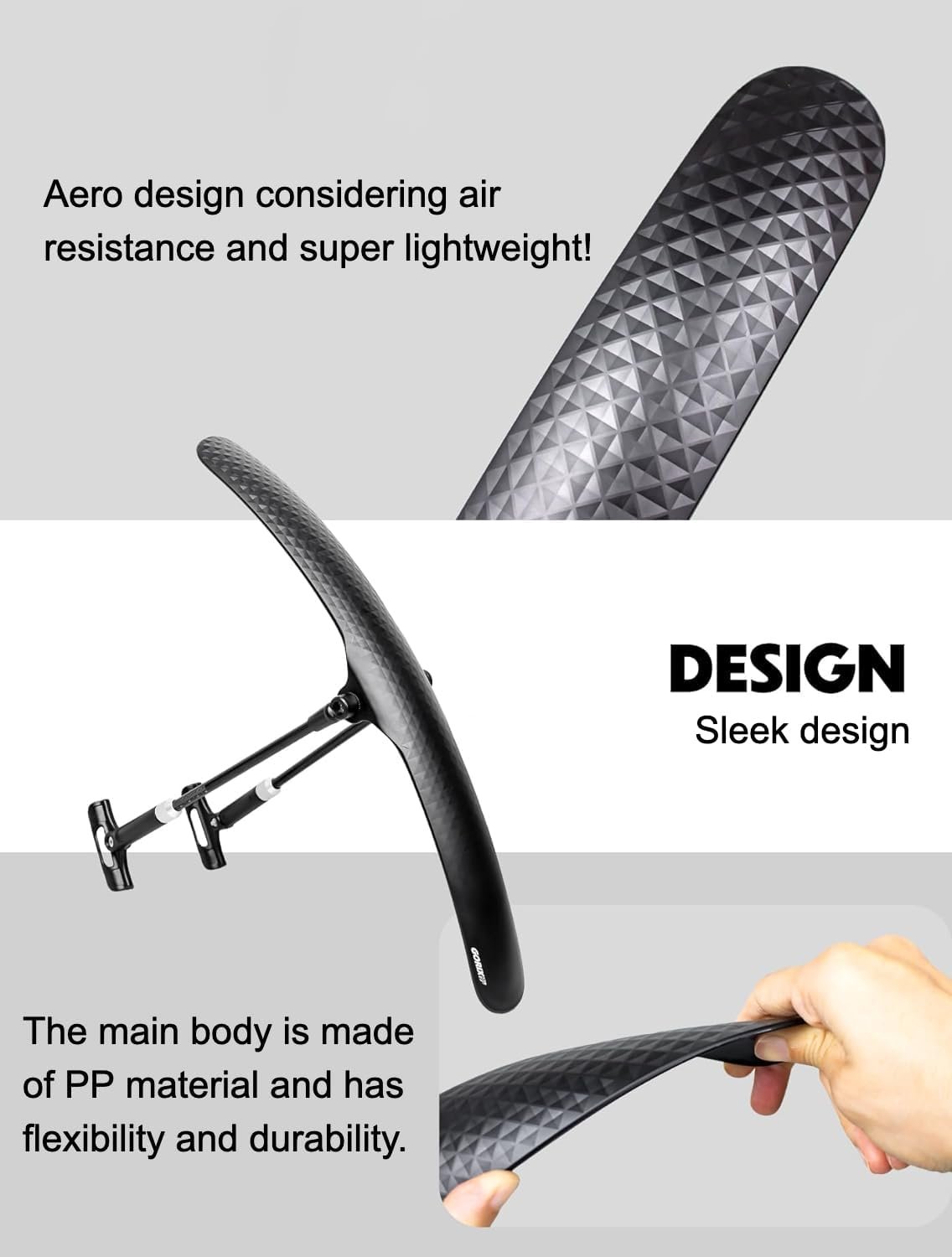 ・[For both front/rear use] This fender can be installed on the front or rear. [Design] Aero design considering air resistance and super lightweight! Even when installed, it has a slender form that matches any sports bicycle. [Adjustable] The support that connects the bicycle and fender can be adjusted in length and angle, allowing for fine adjustments and making it easier to install the fender in the ideal position.