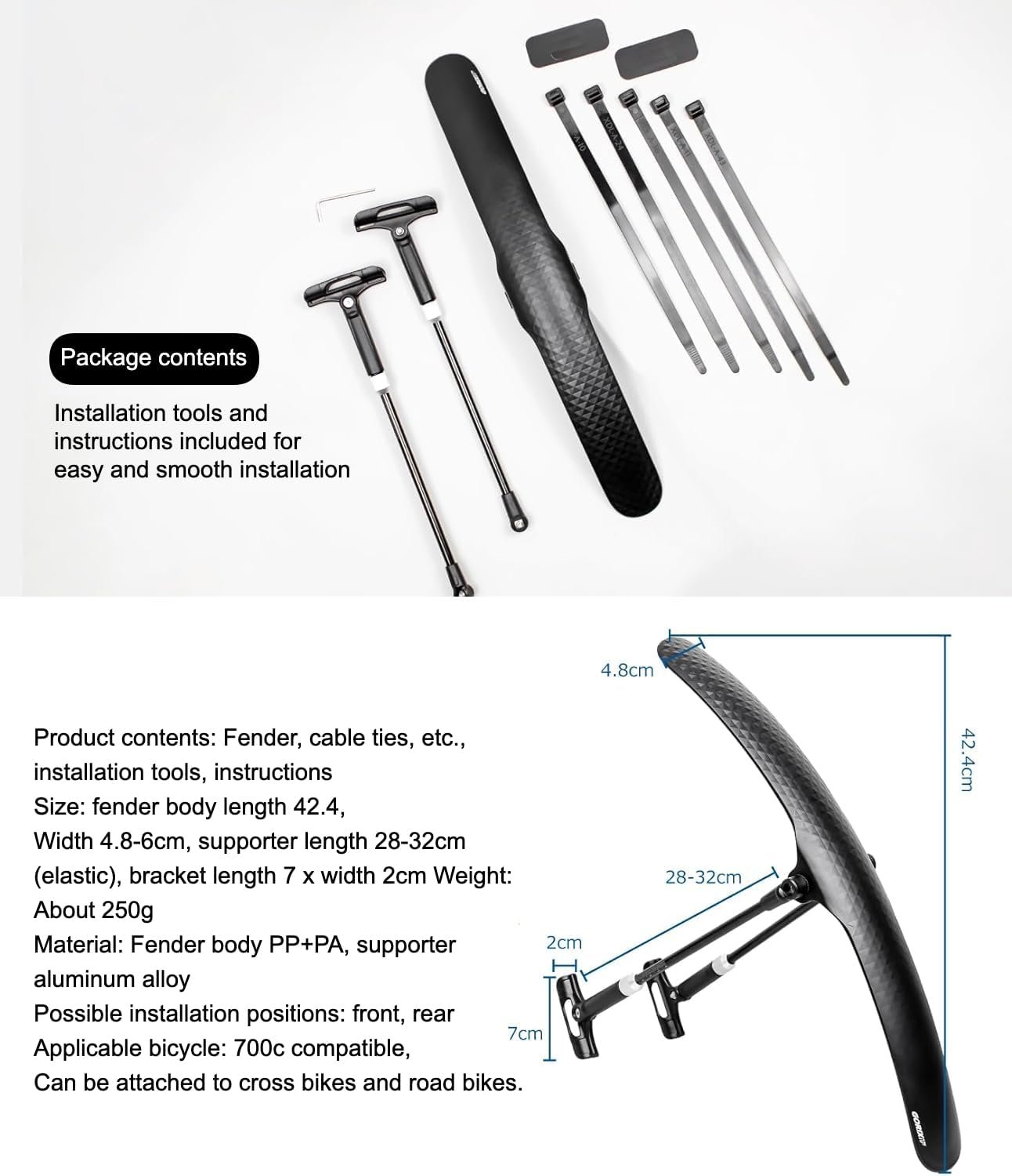 ・[Product contents] Fender, cable ties, etc., installation tools, instructions [Size] Fender body length 42.4 cm, width 4.8-6 cm, supporter length 28-32 cm (stretchable), bracket length 7 x width 2 cm [Weight] Approx. 250g [Materials] Fender body PP+PA, supporter aluminum alloy [Possible installation positions] Front, rear *Please check for looseness of screws.