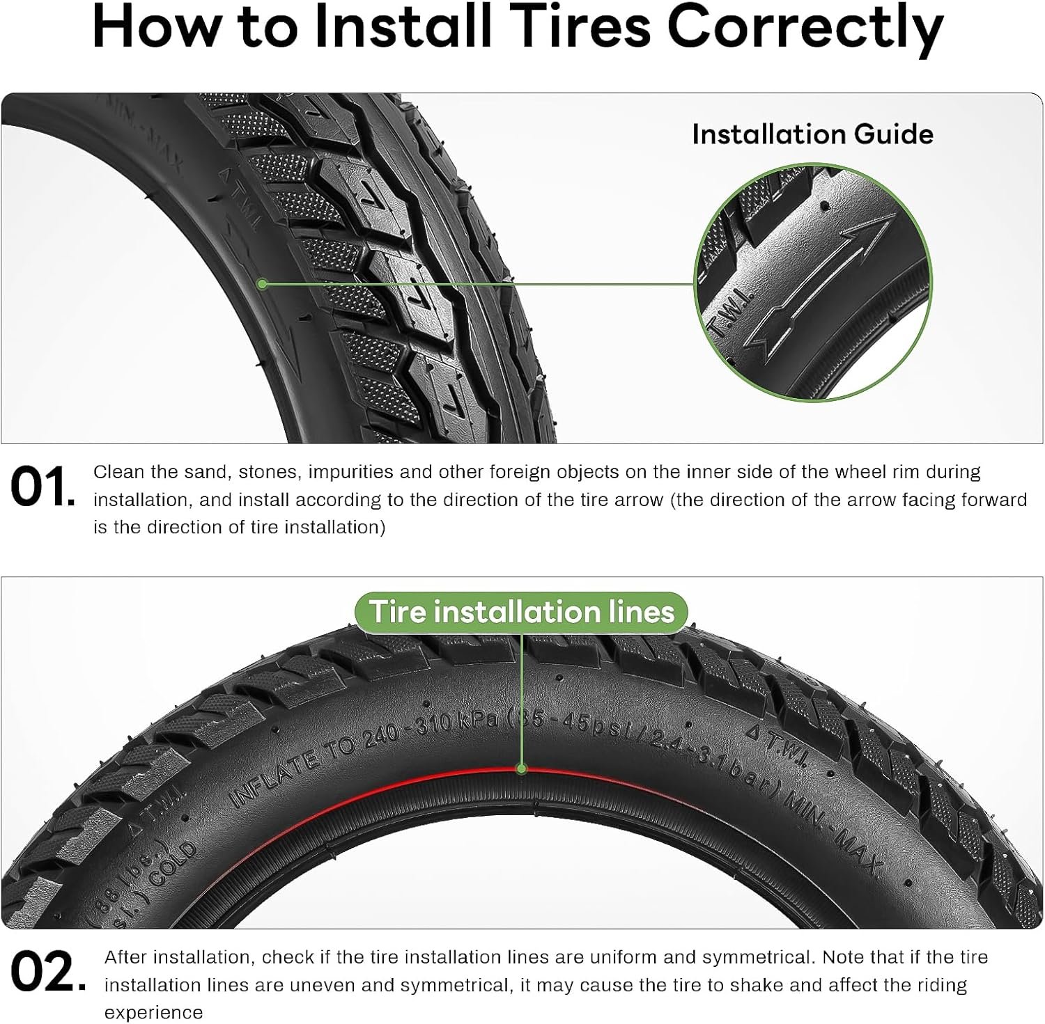 NOTE: Before installing, check to see if the inner tubes are completely sealed by putting them in water, if there are any bubbles, they are already damaged. Please contact us immediately.