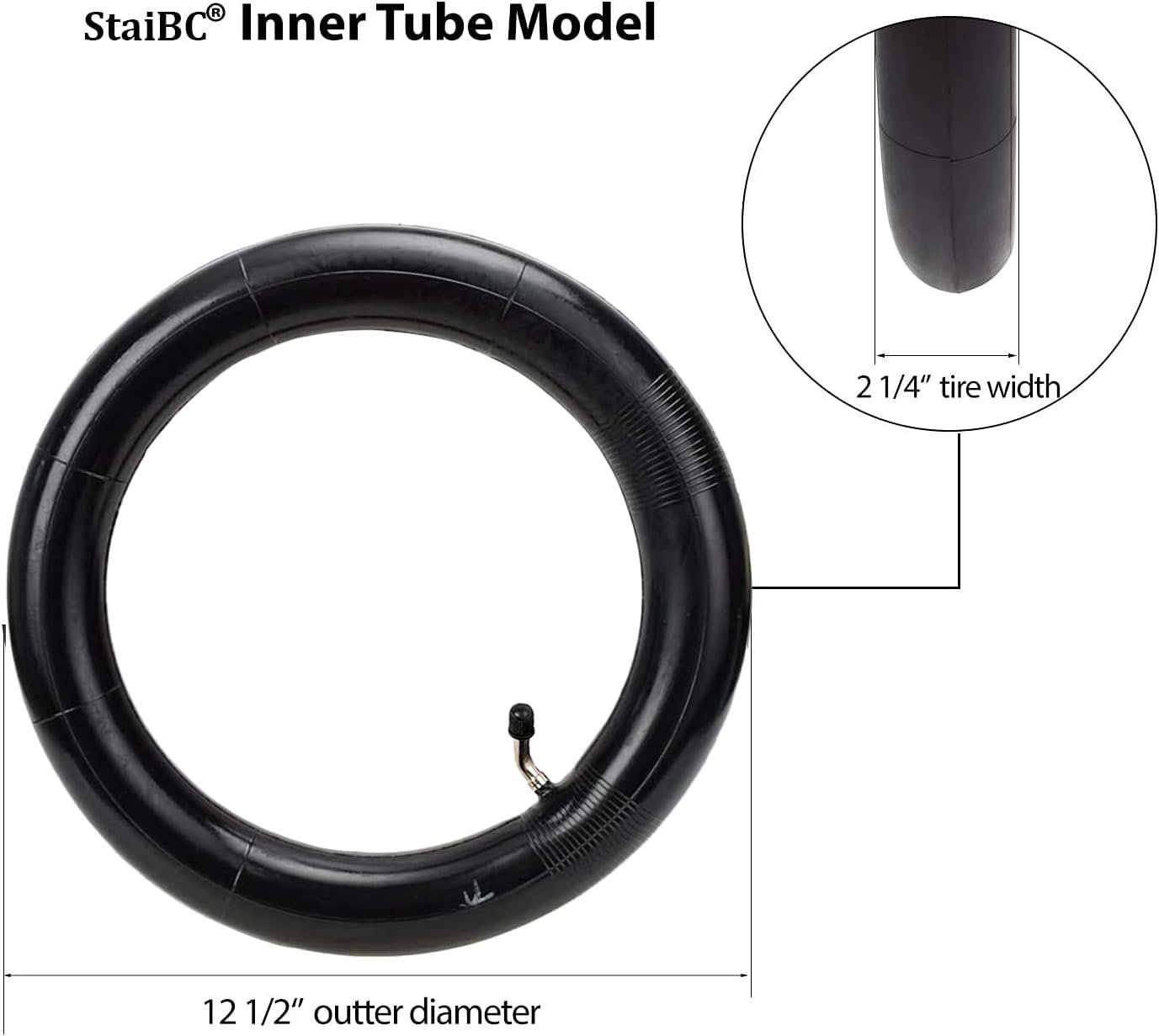 HIGH QUALITY:This 12.5×2.25 inner tube is made of butyl rubber, which is better in air tightness, elastic damping and aging resistance than natural rubber. Heavy duty inner tube with CR202L-A60 Angled Valve Stem. Size: 12 inch 1/2 X 2 1/4 inch (12.5 X 2.25).