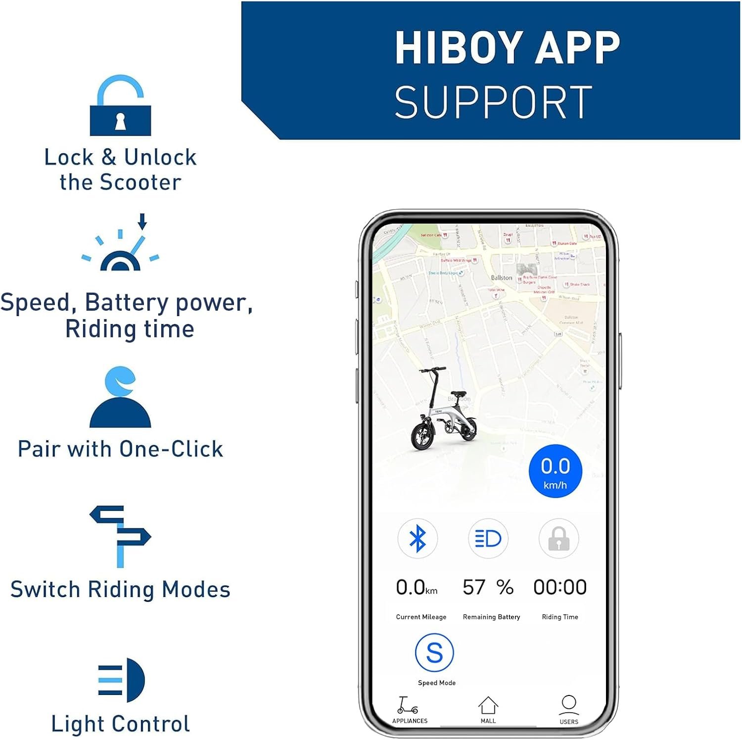 【Smart APP】Simply connect the Hiboy App via Bluetooth to lock your scooter, change the speed mode, and adjust the speed unit. It works on iPhone and Android smartphones.