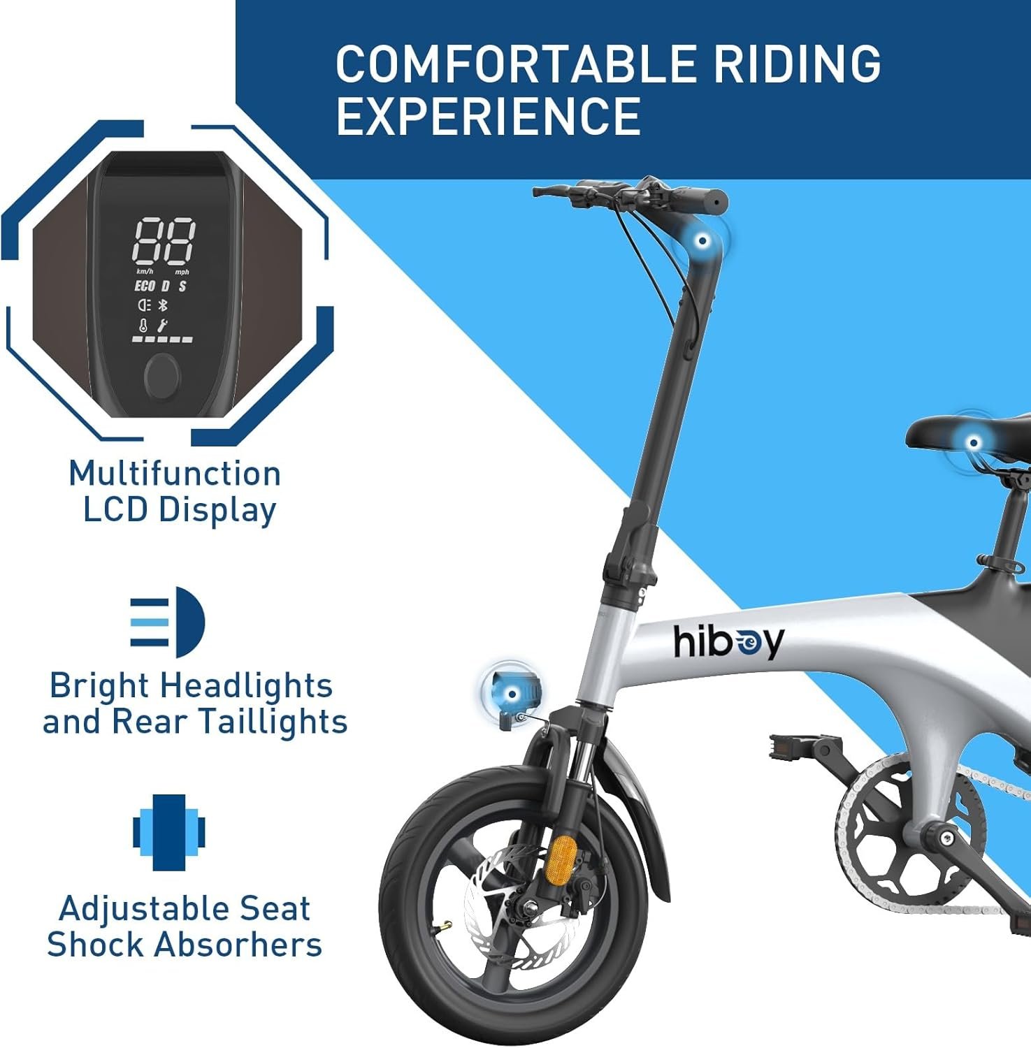 【Riding Safety】Bright front lights, tail lights, and front fork reflective sheet, coupled with a dual disc brake system, ensure your riding safety to the greatest extent.