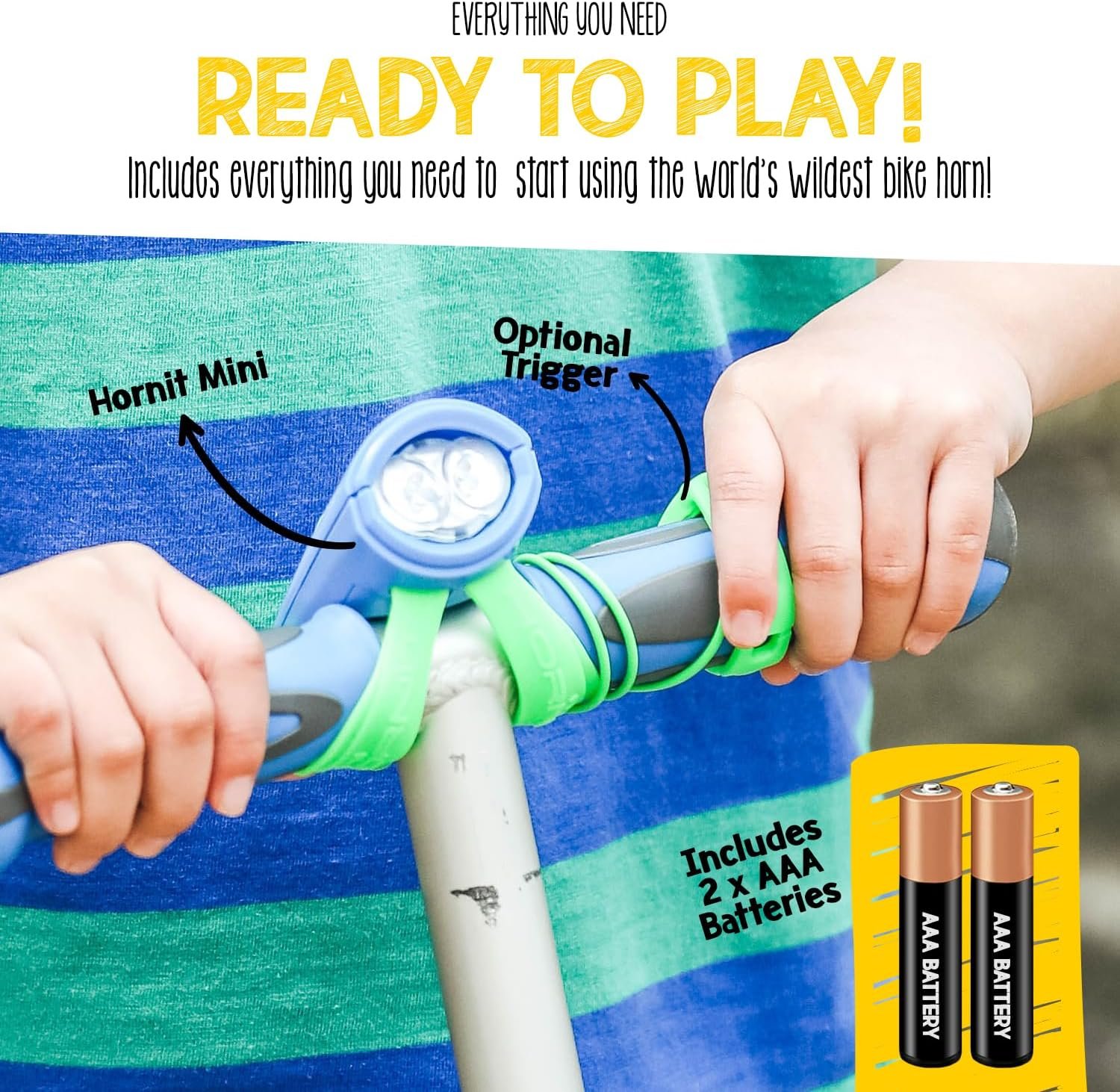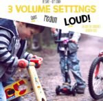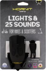 With a range of 75-80 decibels, the Hornit Mini is a kid-friendly, toy-tested combination bike horn & headlight! With 25 sound effects and 5 light settings, children can turn their bikes into almost anything! From a motorcycle to a helicopter, and even magic carpet, the limit is their own imagination. The Mini is intended for use by small children. For adults and older kids more likely to be riding on actual roads, the Hornit dB140 has a range intended to be heard in traffic.