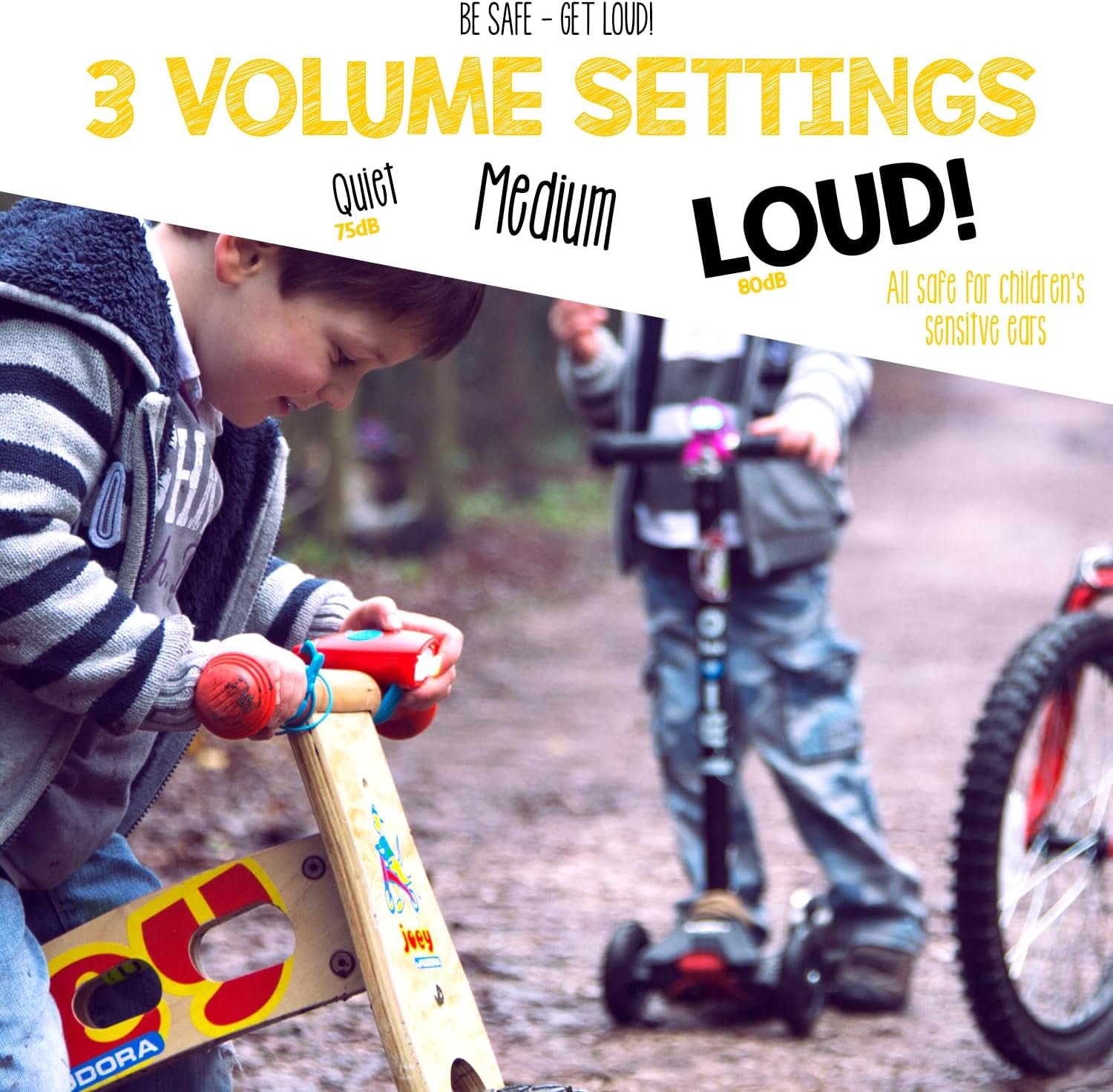 Choose from 25 amazing sounds – Bike Bell – Olé Trumpet – Racing Cars – Police Siren – Motorbike – Laser – Helicopter – Fire Engine – Fart – Magic Spell – Aeroplane – Hooter – Burp – Wolf – Rooster – Lion – Elephant – Horse – Hornet – Magic Carpet – Bomb Drop – Reversing Truck – Train – Klaxon – Zapper.