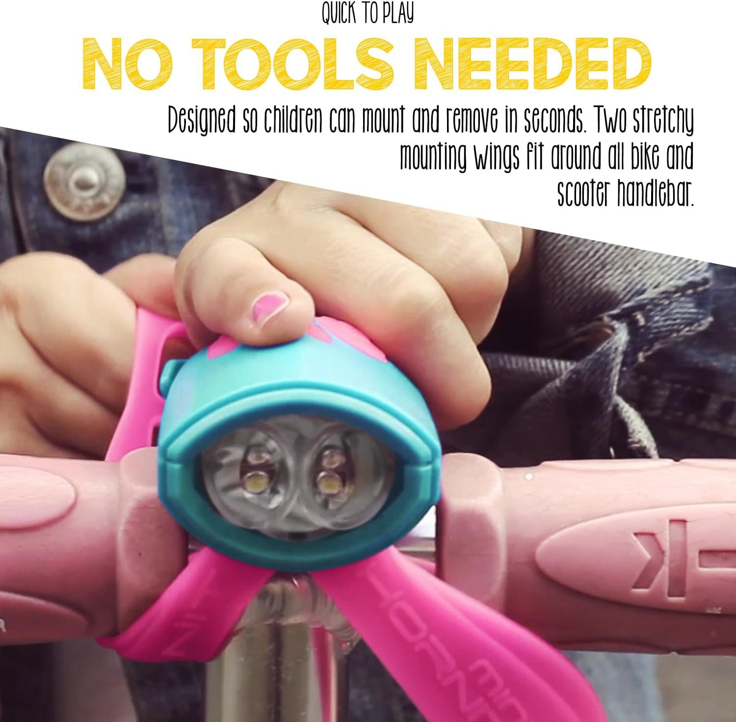 So easy to install, a child can do it in seconds! No tools required for installation or removal. Fits all bicycles and scooters. The two stretchy wings lock it securely in place no matter what size handlebars you have. Kids can take their favorite biking accessory with them as they graduate from their first balance bike up through small wheels with coaster brakes, and even a cruiser!