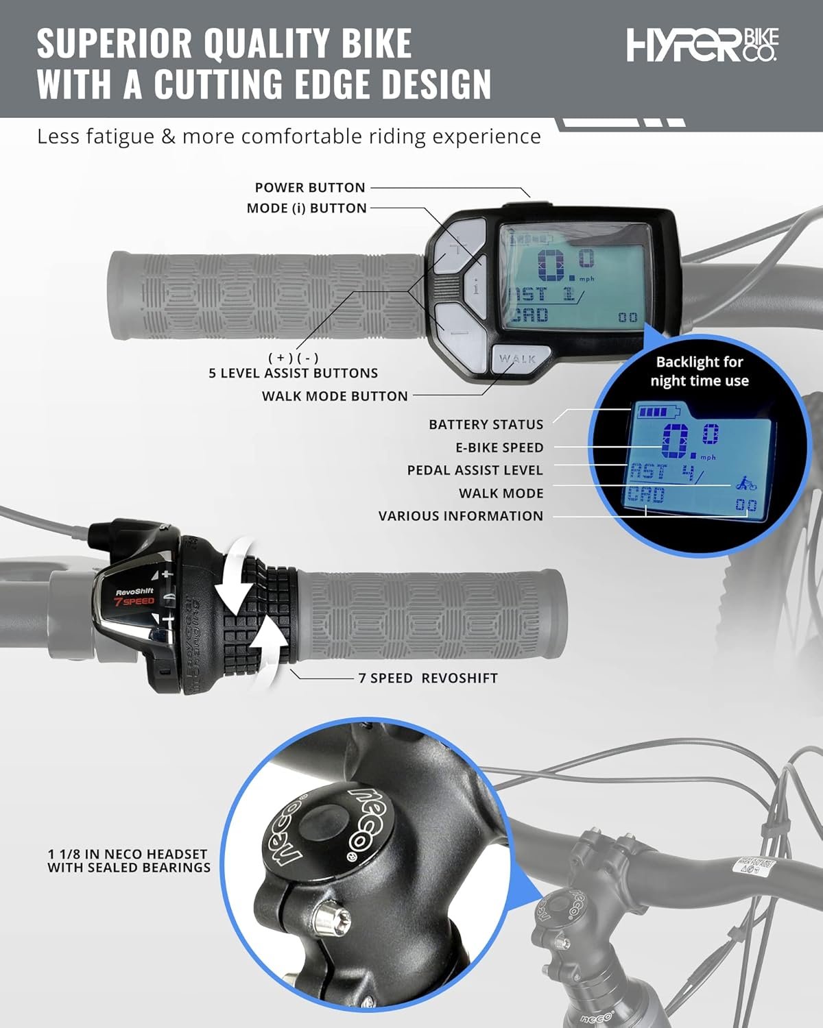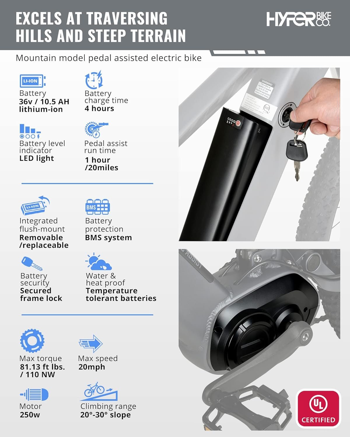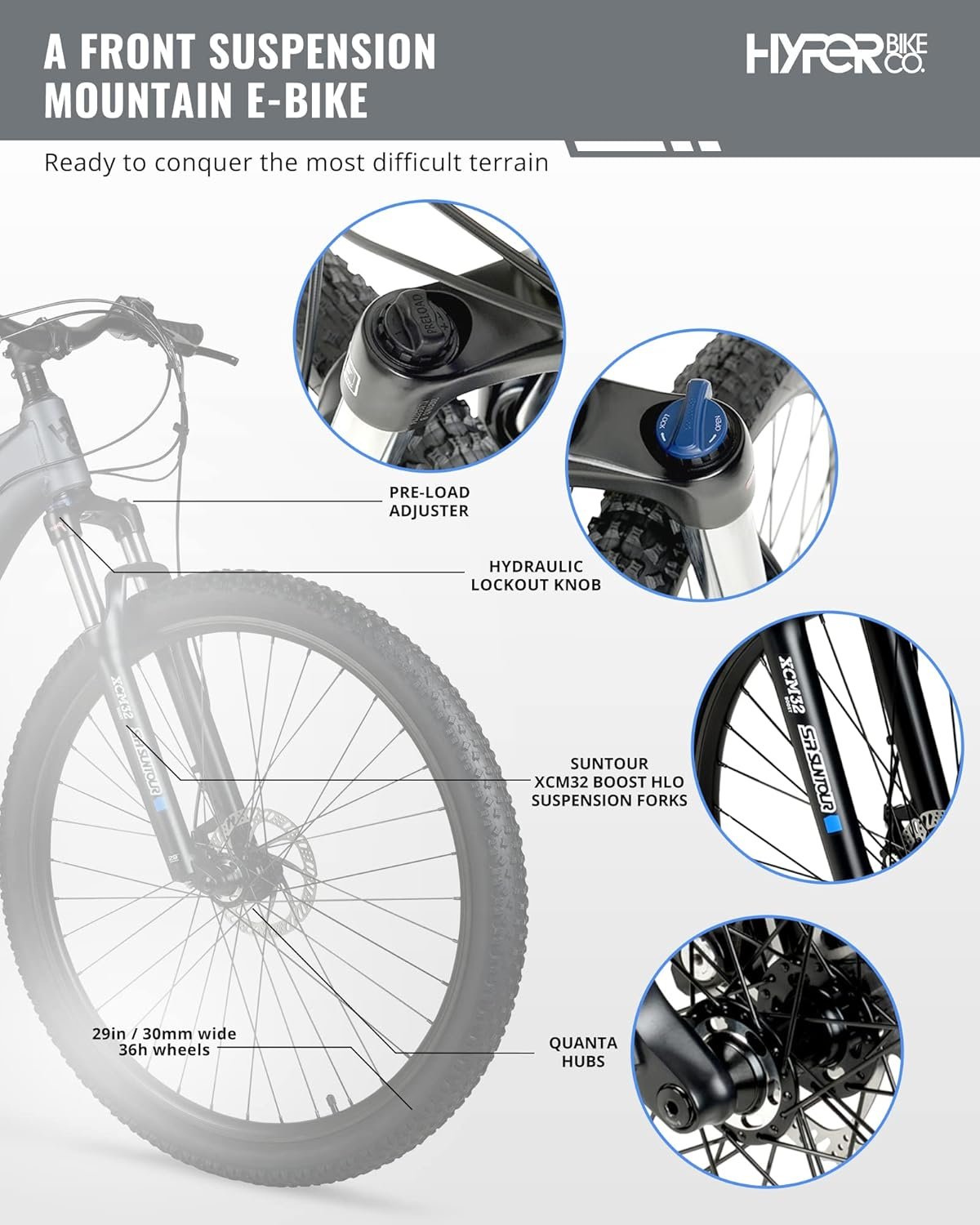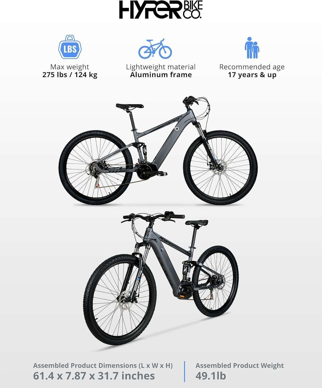 BUILT FOR THE TRUE MOUNTAIN BIKE ENTHUSIAST READY TO CONQUER THE MOST DIFFICULT TERRAIN. Hyper E-Ride mountain adult electric bicycles have a max rider weight of 275 lbs with all the assisted power you’ll need for your next outdoor adventure.