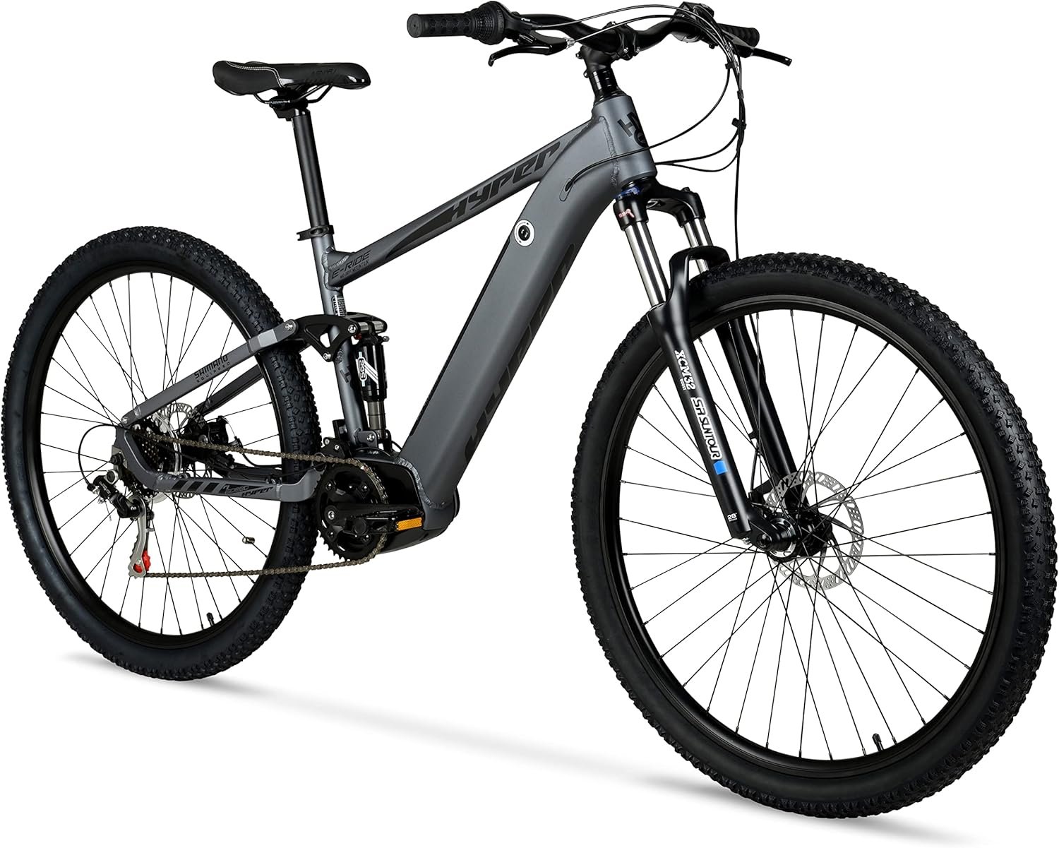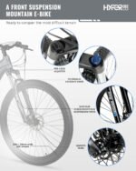 A FRONT SUSPENSION MOUNTAIN E BIKE WITH A MID-DRIVE ELECTRIC MOTOR. The Hyper E-Ride features a 29 inch lightweight aluminum dual suspension frame, a rear air shock, double wall alloy rims, and 3 piece alloy cranks to handle any mountain terrain.