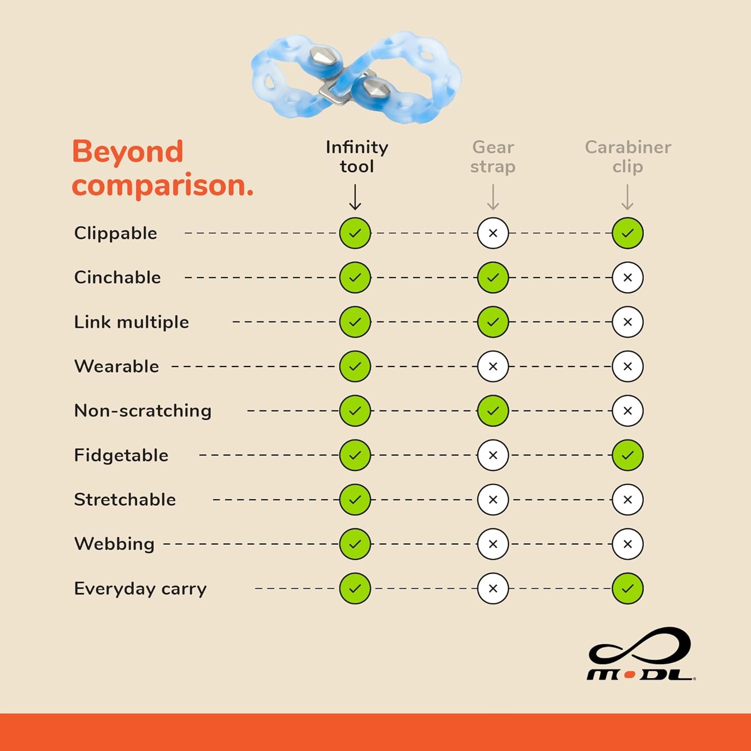 COMPATIBLE with MOLLE, D-rings, carabiners, key rings, backpacks, and many other types of gear and attachment points. Get creative and see what you can do with the Infinity Tool!