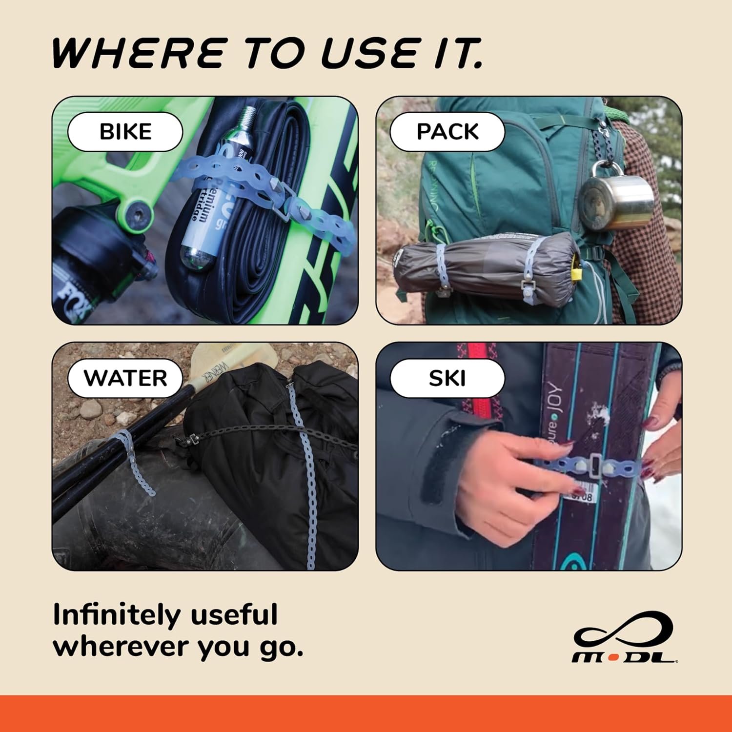The Infinity Tool has limitless uses, but people often use it to secure gear to packs and bikes, organize their things, and make simple repairs on the go.