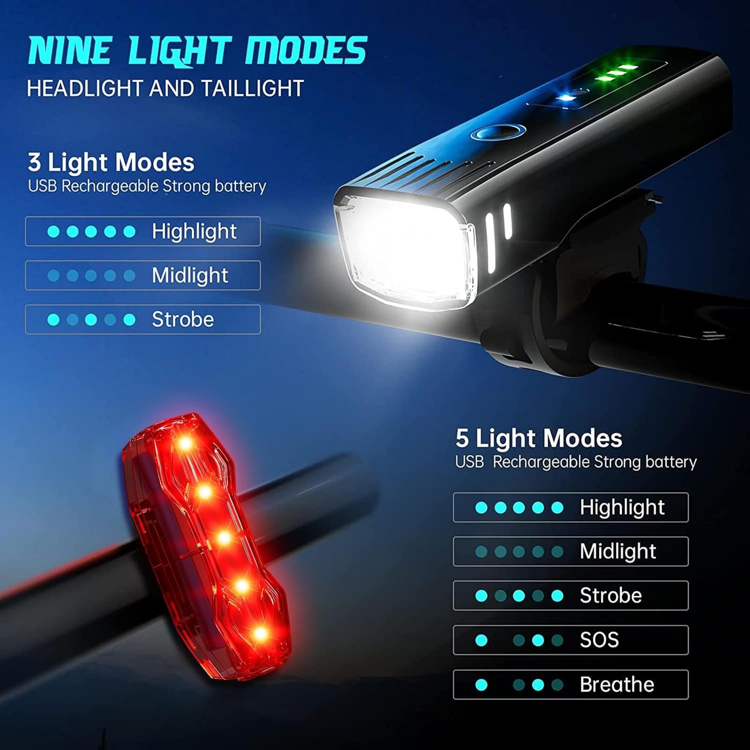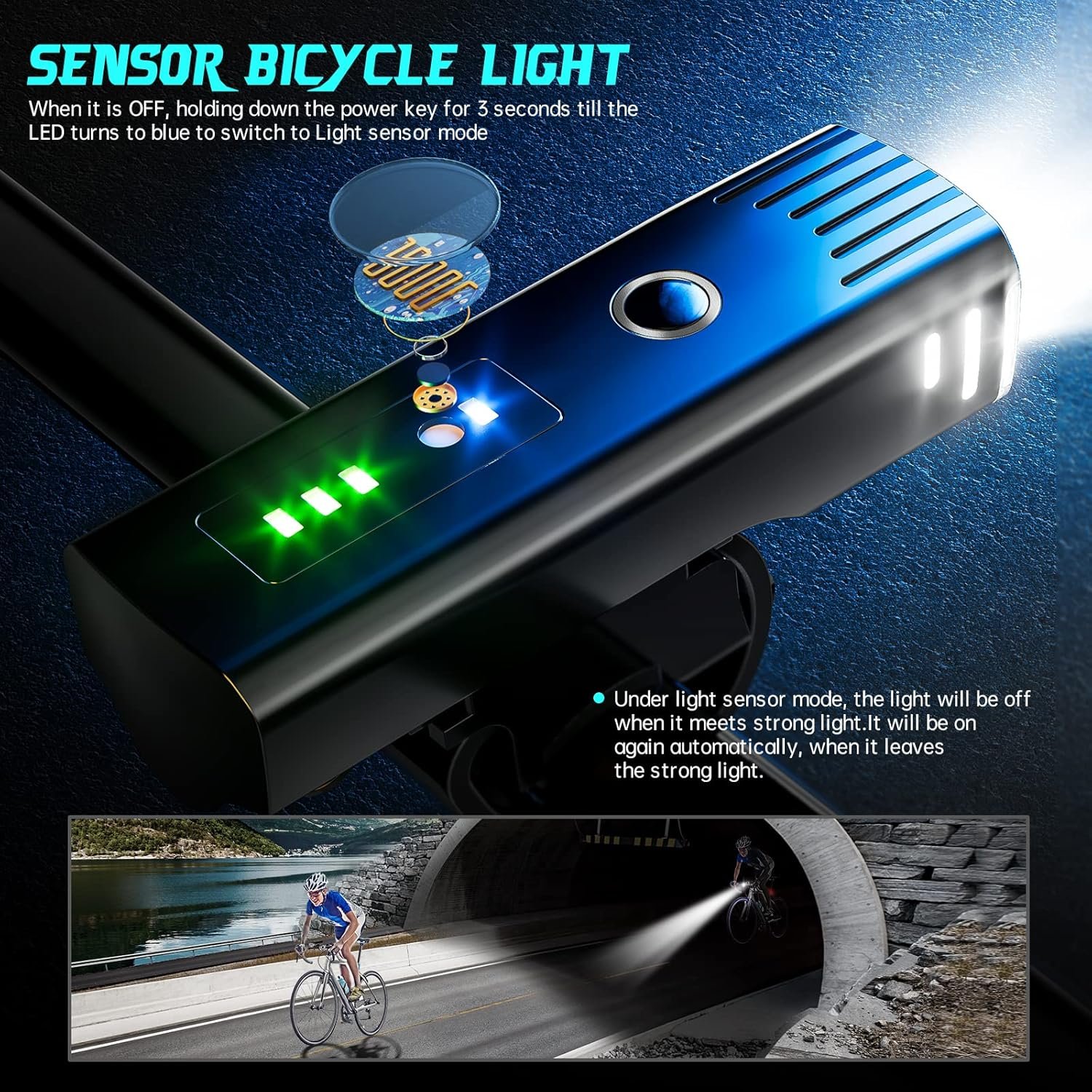 SAVING MODE – Press the switch, indicator light blue light that enters the light sense mode,bicycle light turns on automatically when there is insufficient ambient light,bicycle light turns off automatically when the ambient light is sufficient.