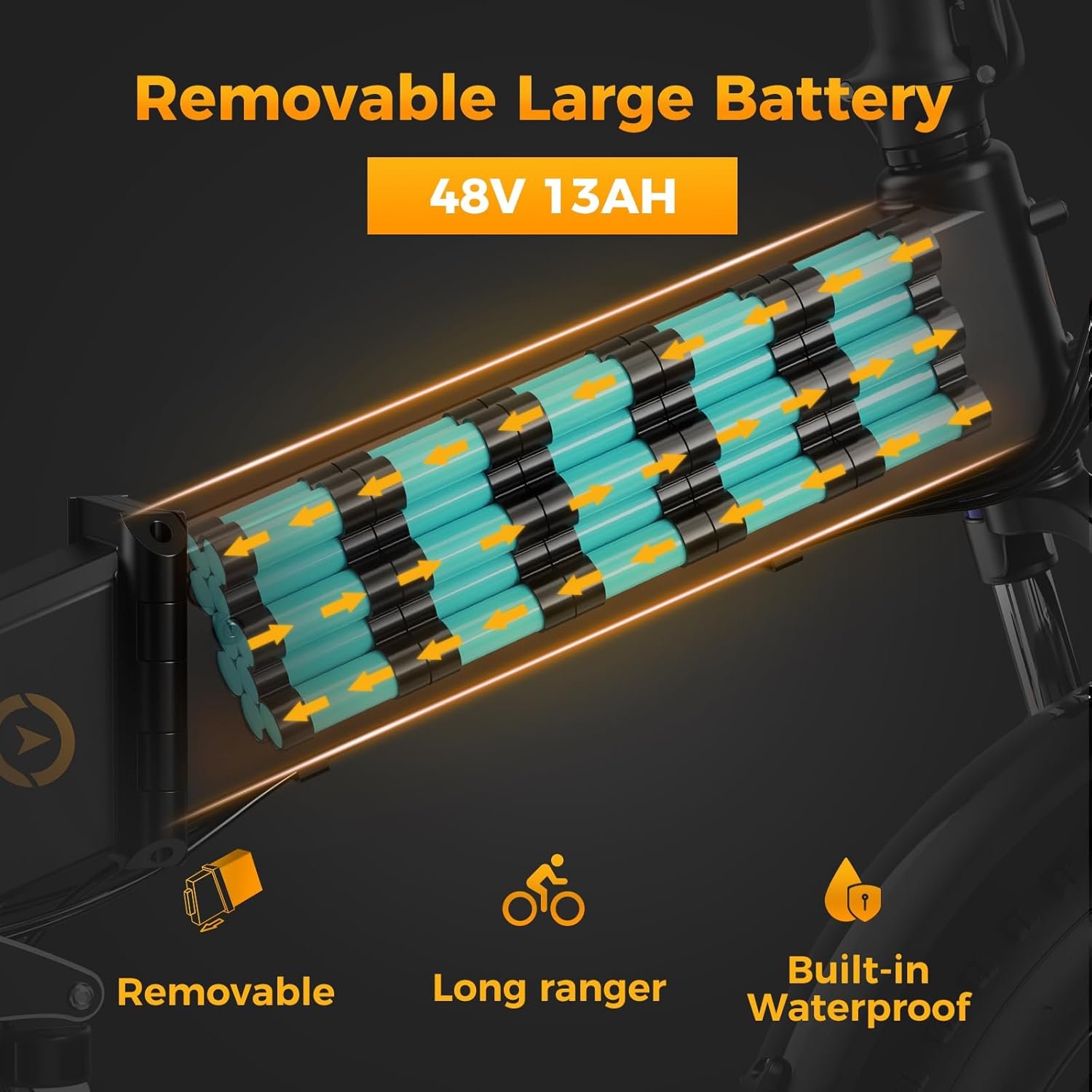 Upgraded Battery – Not only the excellent motor but also an upgraded battery equipped, the 48v 13Ah lithium-ion battery covers a range of 55-70 miles per full charge. The removable battery design makes charging more convenient. dustproof and dampproof, guarantee the safety and life of the battery.
