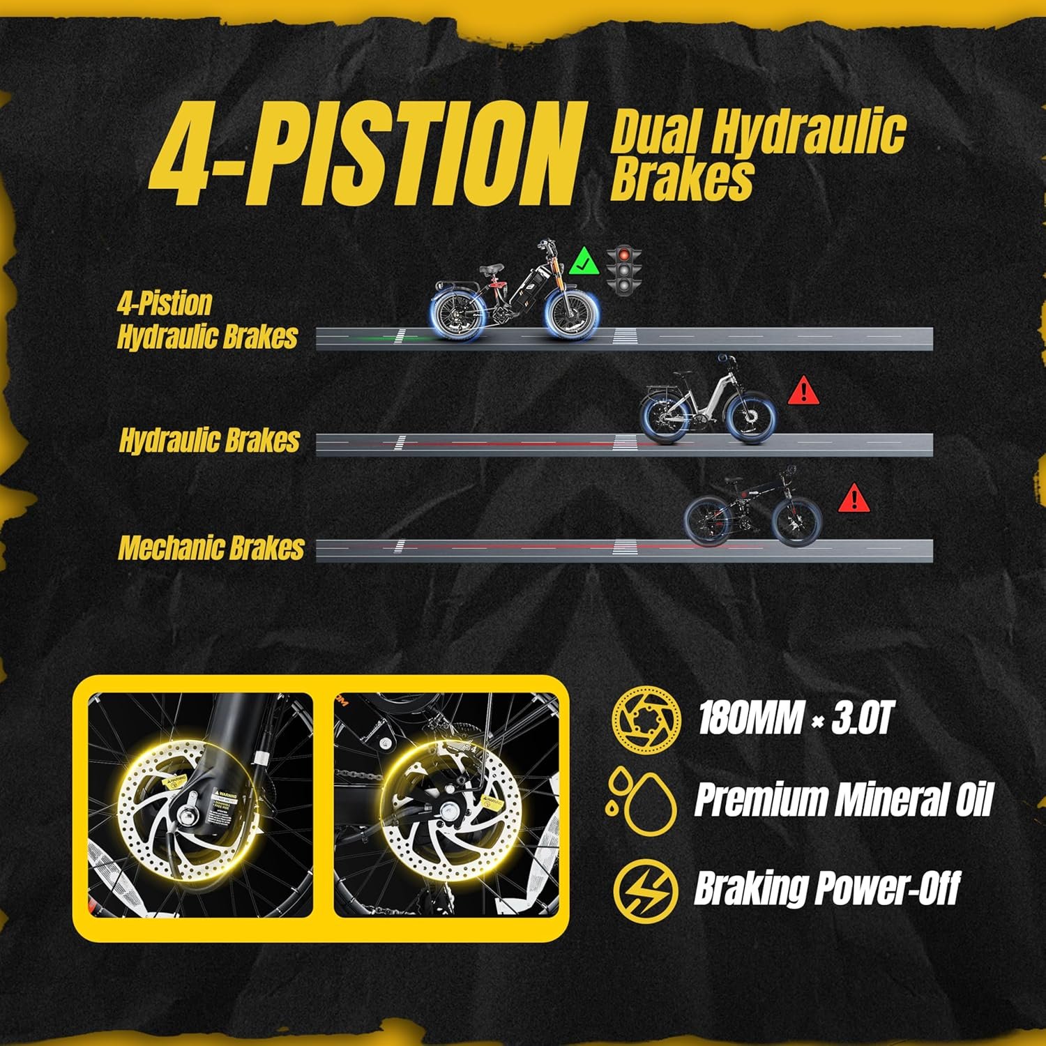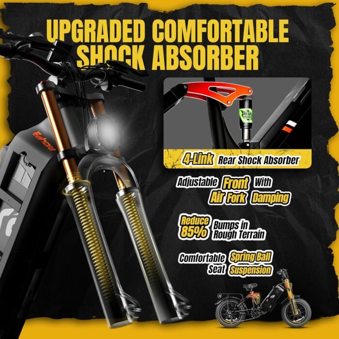 【🚴♂️All-Terrain Safety Protect from Hydraulic Brakes & Full Suspension】eAhora Juliet Pro 2 electric mountain bike for adults have Advanced upgrade ①4-piston hydraulic brakes + brake cut-off: Stops instantly even at 40MPH in rain. ②Adjustable Suspension Damper Front Fork+ 4-link rear suspension: Reduces joint stress by 50% on rocky trails. ③The stronger frame guarantees a max load capacity of up to 400Lbs.
