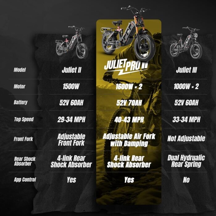 【🌌4400W Dual Motor Beast to 43MPH & 40° Climb】2025 eAhora Juliet Pro 2 electric bike Conquer mountains and crush commutes with 4400W Peak(1600W*2) power—43MPH top speed and 2*120N. m torque to scale 40° slopes. Dual 52V controllers deliver motorcycle-like acceleration, Tested in Rockies’ trails by 210lbs riders. As its excellent performance and industry-leading design eAhora Juliet Pro 2 is the best in its class, bring you the thrill of riding like lightning.