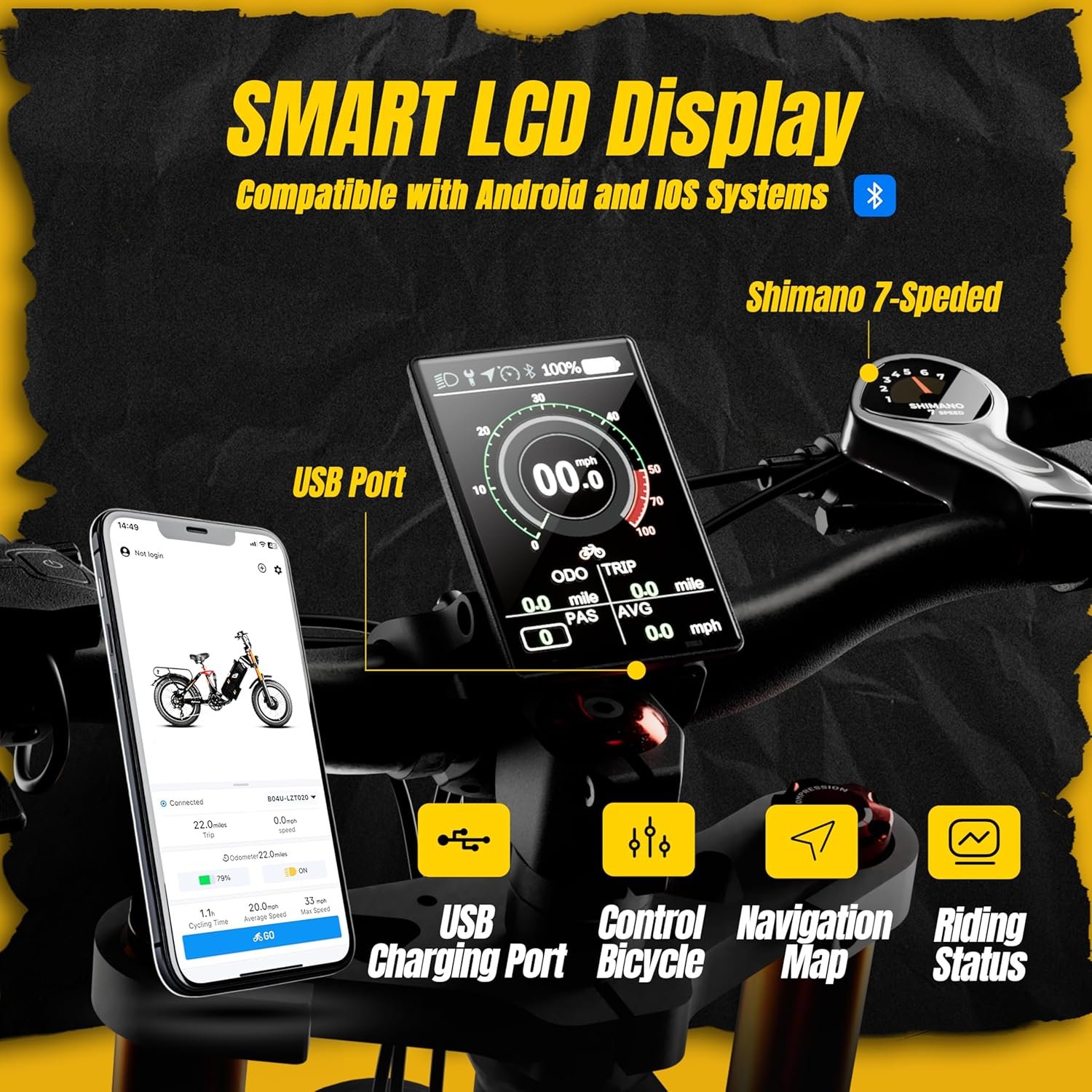 【🗺️Smart Control Hub: GPS, Data Sync & USB Charging】Juliet Pro 2 electric mountain bike with LCD display + APP control tracks speed, battery, and map navigation. USB port charges phones while riding. Sync ride data to plan your next expedition.