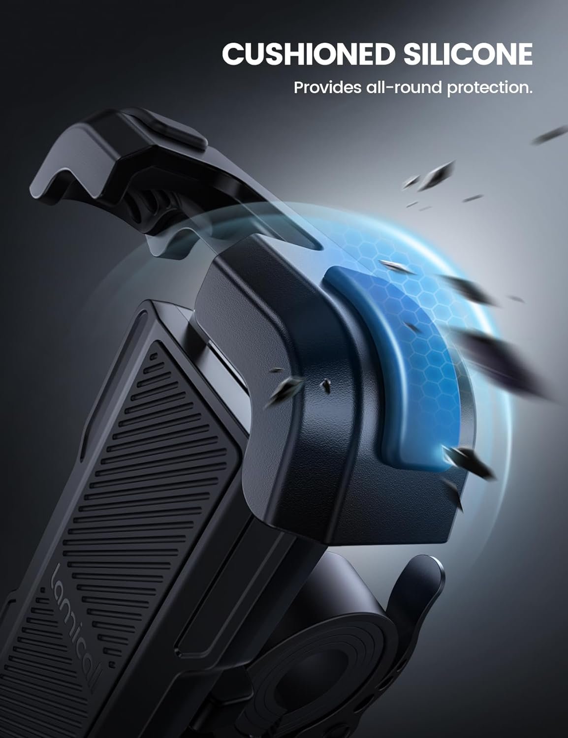 【 Rubber Protection】 This bike phone mount comes with silicone pads that keep your phone from scratches and vibration. The motorcycle phone mount holds your phone perfectly when cycling. Also with up and down linkage phone clamp, can easy install the phone into the phone clamp.