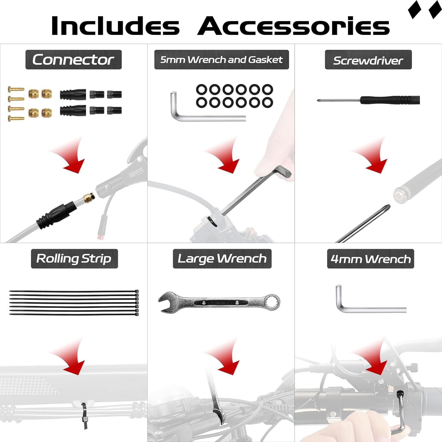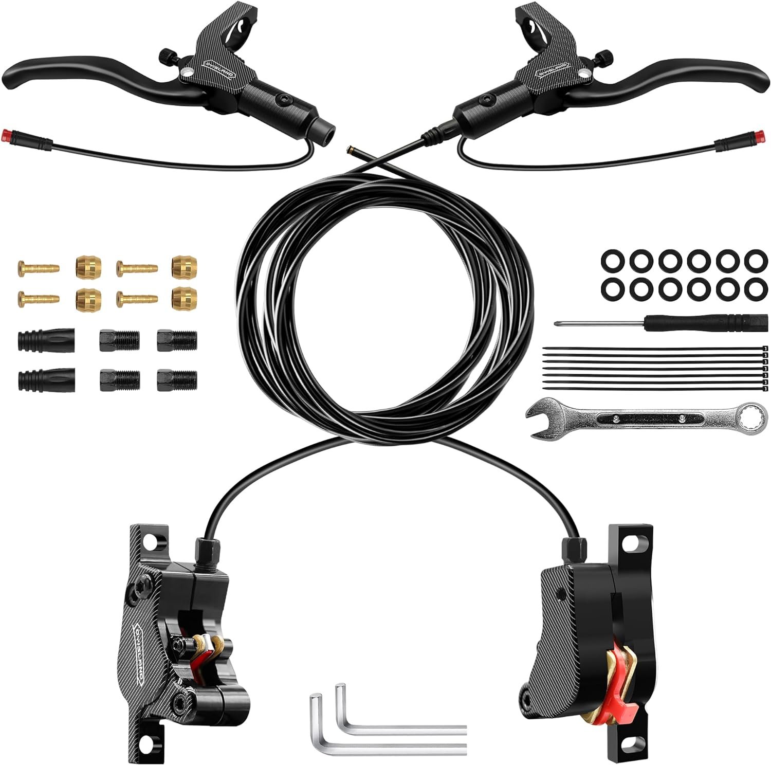 【Kit Includes】Electric bicycle 2-PIN hydraulic disc brake set(2*brake levers/2* brakes and 2*BH59 connectors) installation tools and screws;The rear brake hose and control lever are separated for easy internal routing. The hose is pre-filled with environmentally friendly mineral oil, no need to bleed when using.