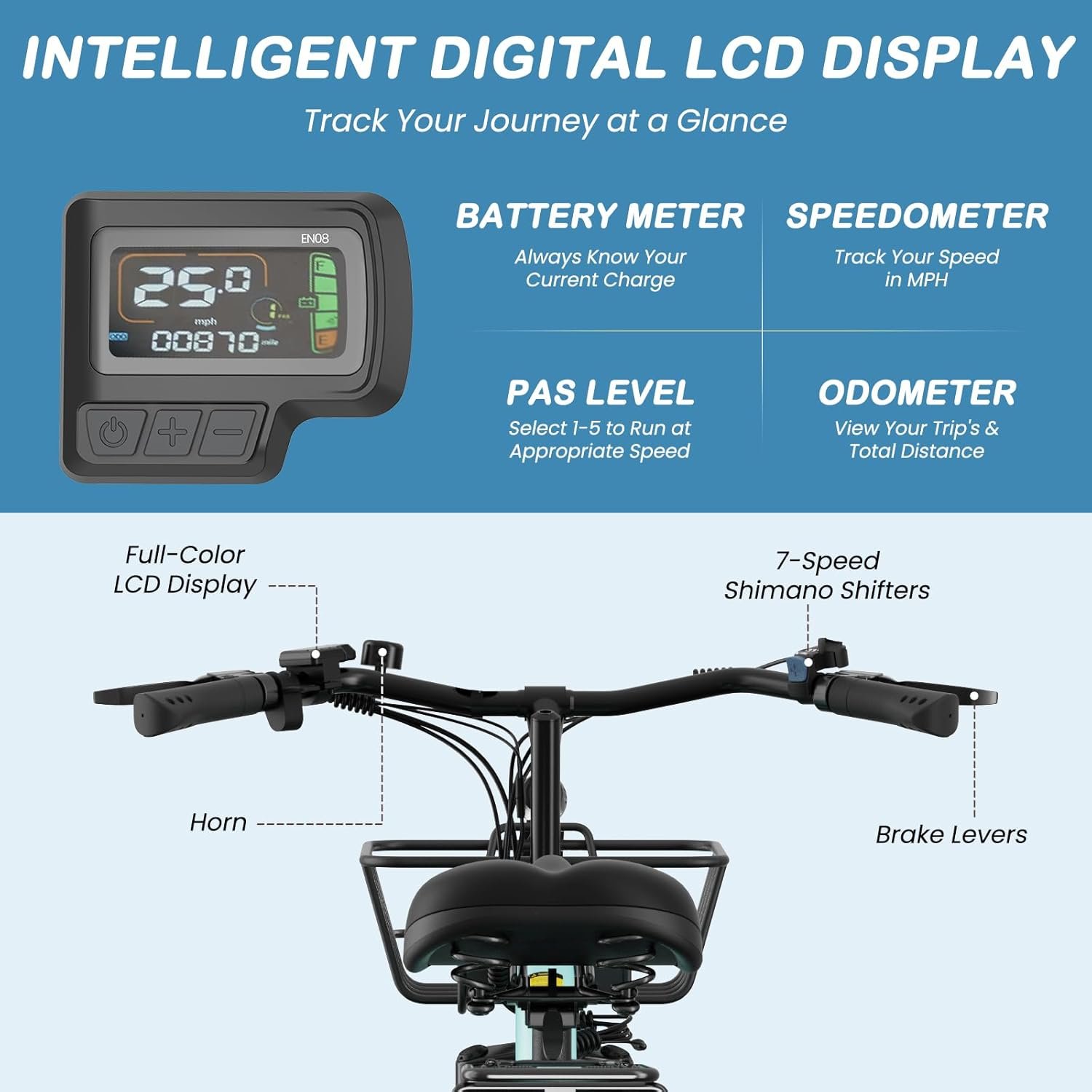 LCD DISPLAY: This Electric Bike offers three riding modes (pure electric mode, pedal-assist mode, and classic bicycle mode). The color LCD display shows real-time data such as speed, battery level, mileage, and more, making it convenient to track your ride. Ensuring a safe and enjoyable experience