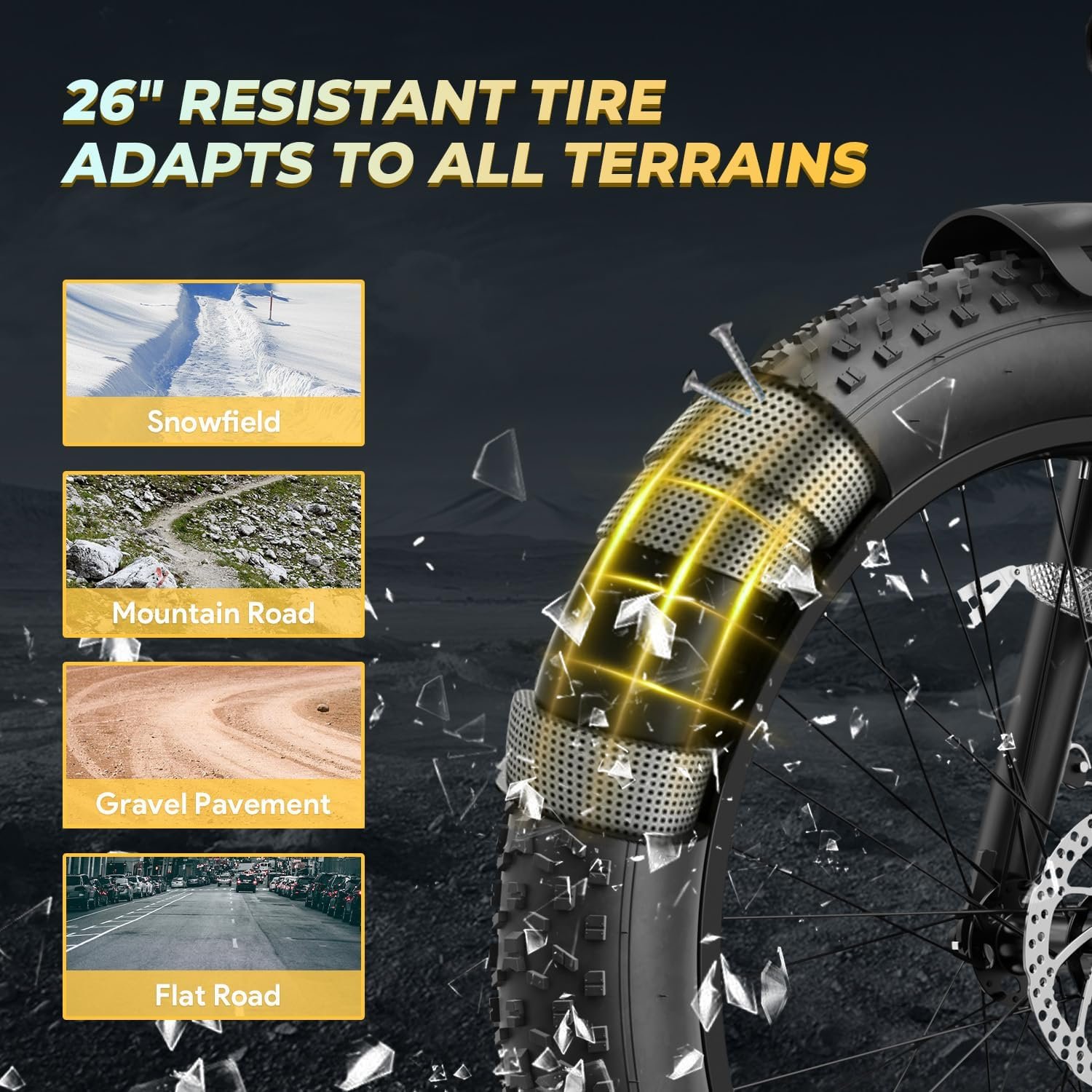 【Wide tire design and comfortable shock absorption】 The 26” x 4.0” wide tire design not only enhances grip, but also brings excellent stability and comfortable shock absorption, making your ride more stable and comfortable.