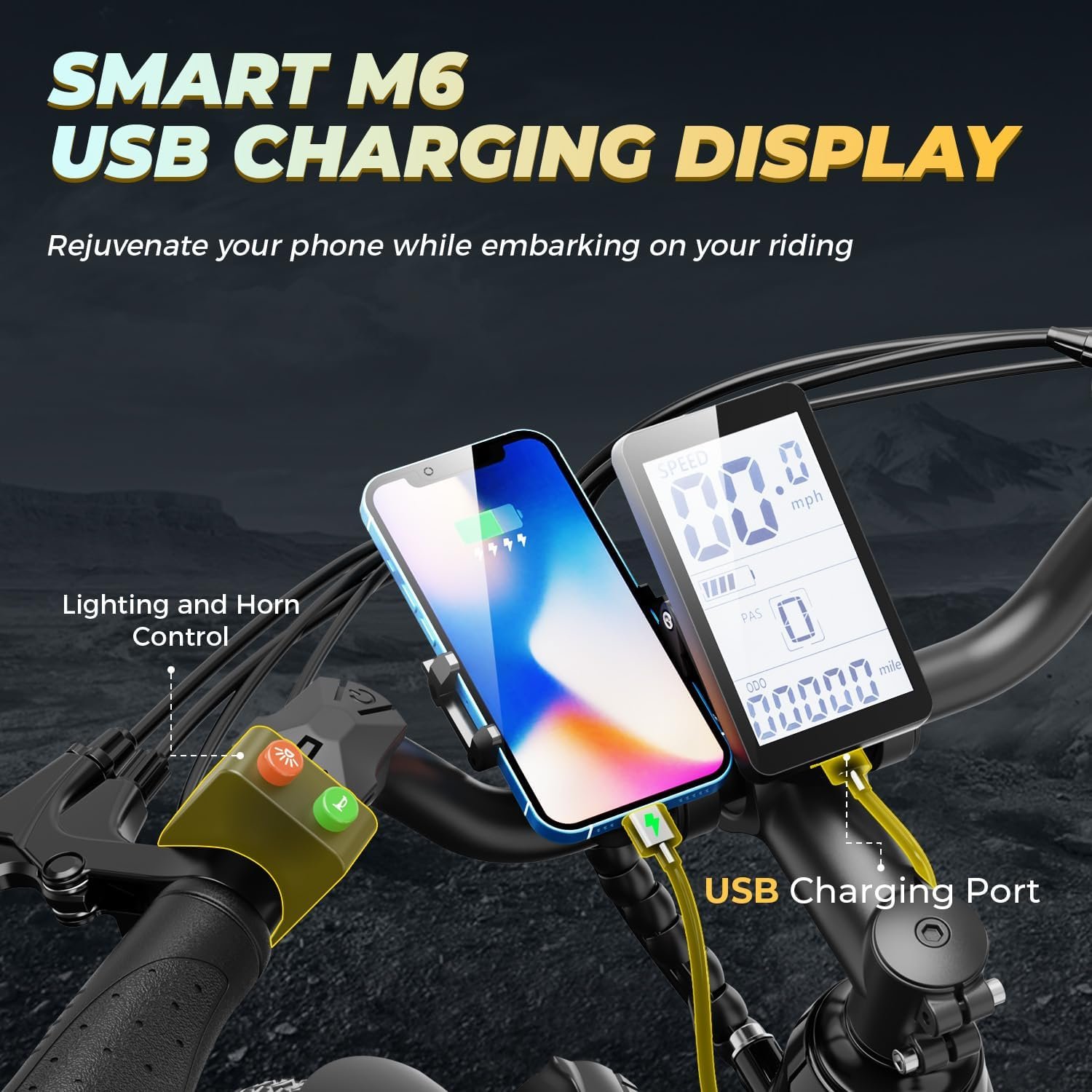 【Humanized riding】This e bike is equipped with a USB charging port, allowing you to charge your phone anytime and anywhere while riding. It provides 5 riding modes (electric, pedal assist, cruise control, normal riding, walking assist) and 7 speeds to meet your various riding needs.