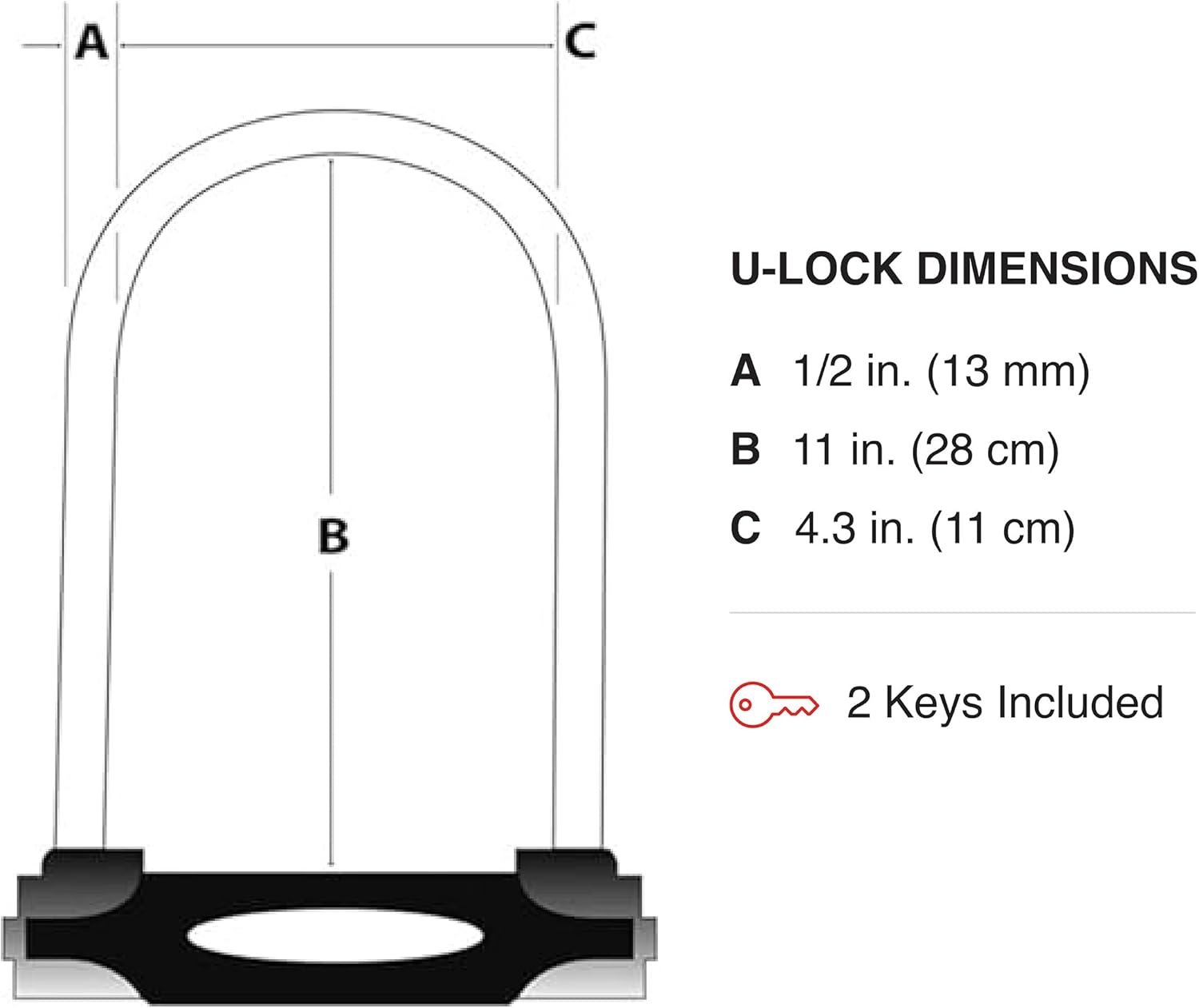 The Master Lock No. 8285EC Heavy Duty U-Lock with Looped-End Cable features a 4-5/16in (11cm) wide hardened steel body for maximum strength and reliability. The 16mm diameter double locking shackle is 11in (28cm) long and made of hardened steel, offering extra resistance to prying, cutting and sawing. The integrated disc key cylinder offers maximum pick resistance. The looped-end cable is 4ft long and features 10mm diameter for additional security. The Limited Lifetime Warranty provides peace of mind from a brand you can trust.