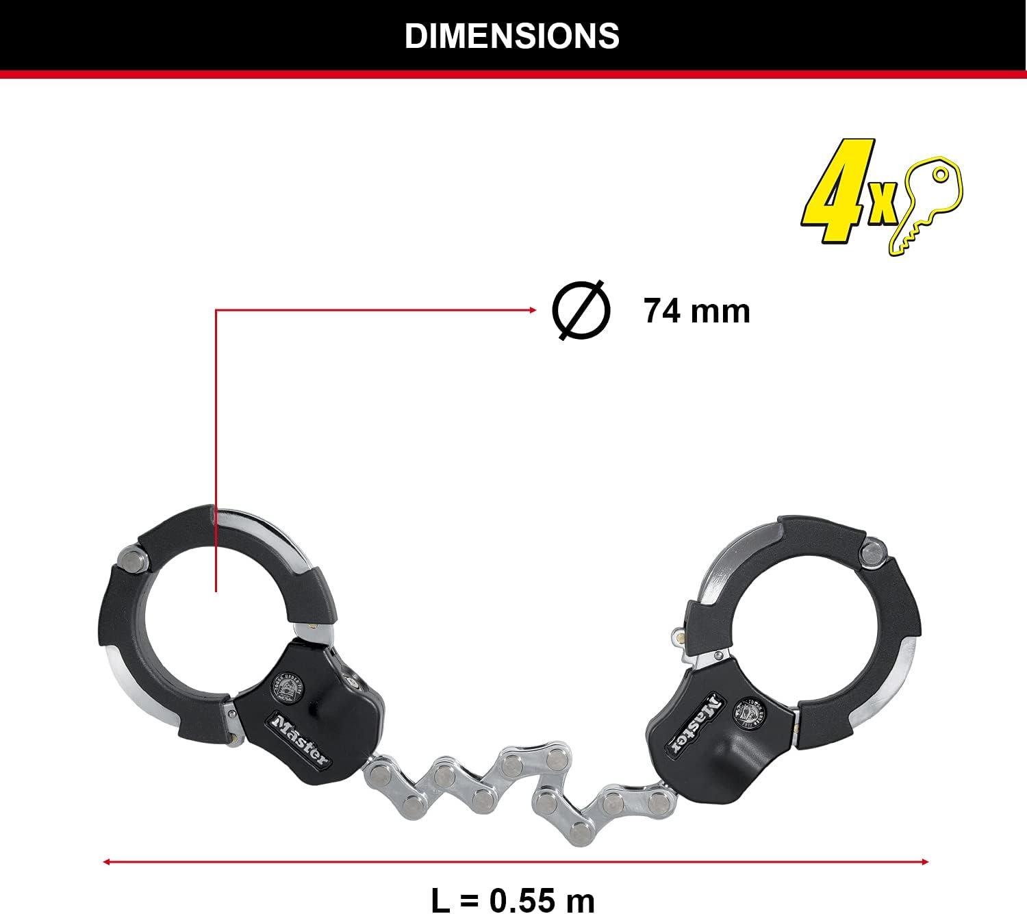 Home E-Bike Accessories Locks MASTER LOCK Police Approved Bike Lock and E-Scooter Lock, Hardened Laminated Steel, 4 Keys, 550 x 76 x 27 mm, for e Bike Scooter Quad