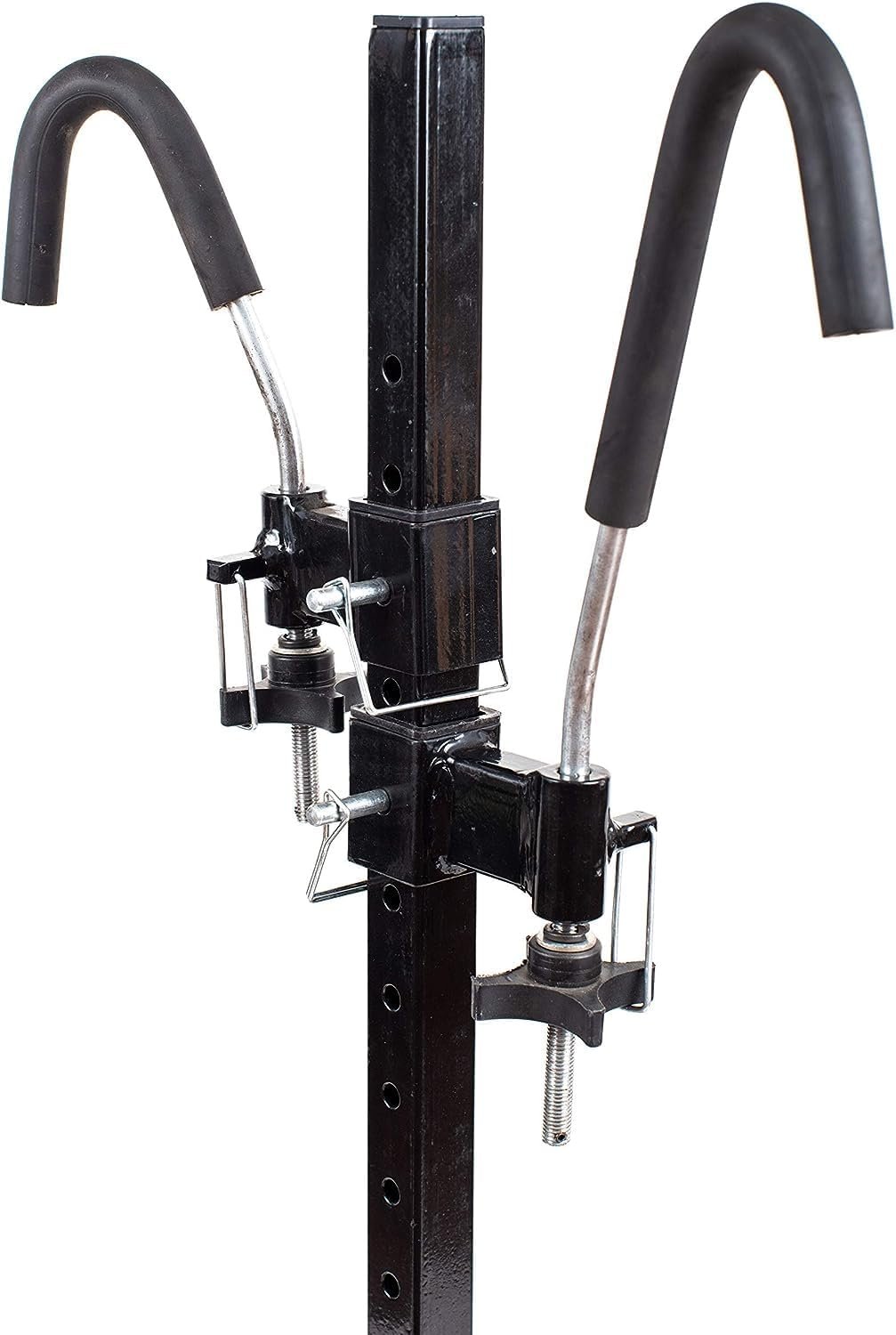 Features a unique hook adjusting system designed to allow quick height adjustment of hooks using quick pins then fine adjustments by rotating knobs to hold bike frame to the rack securely.