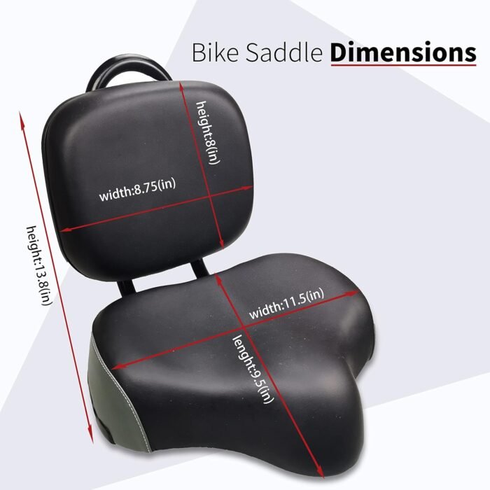 Bike Saddle Specification: Saddle-L9.5inch x W11.5inch; Backrest-W7.75inch x H7inch. Please check saddle dimensions carefully before you purchase.