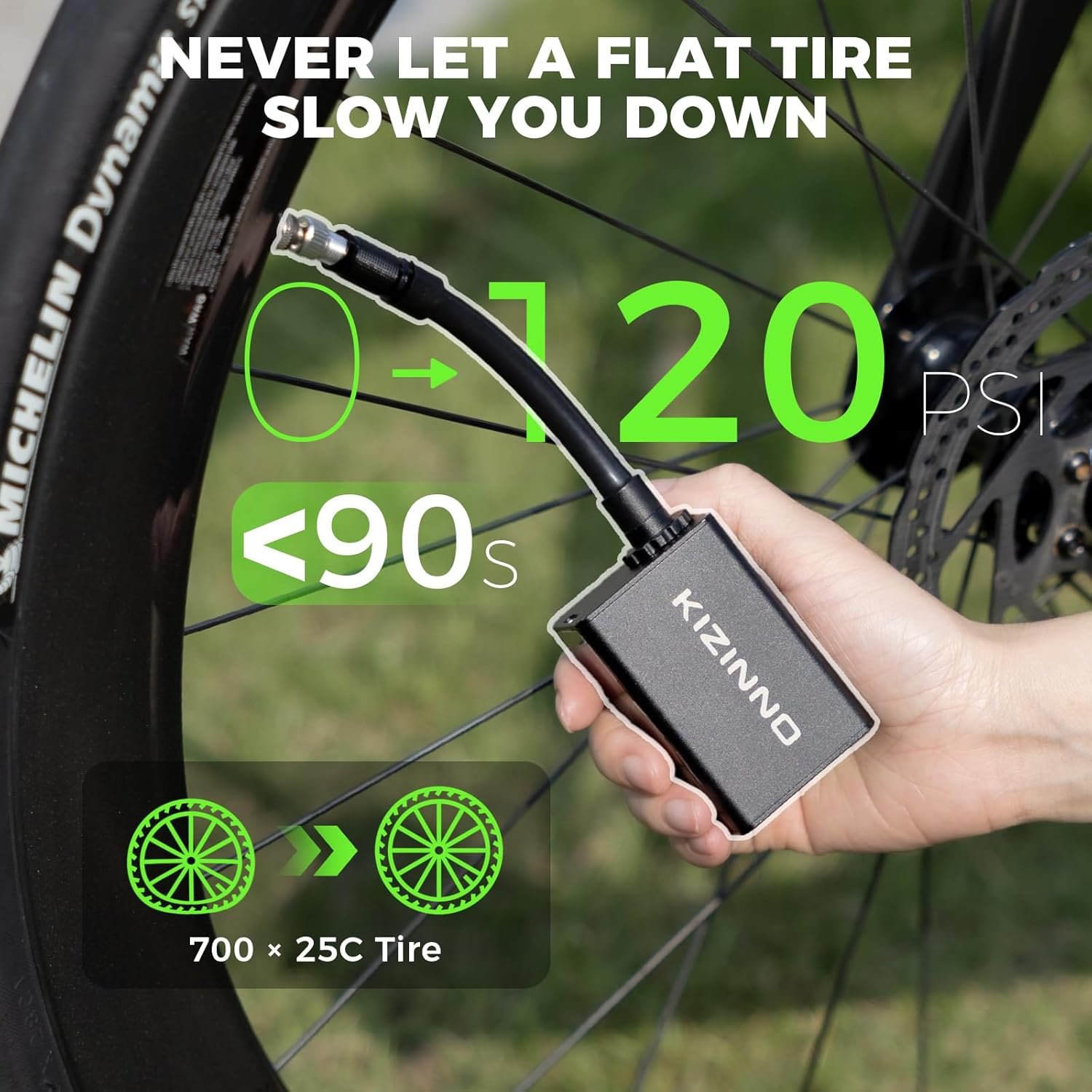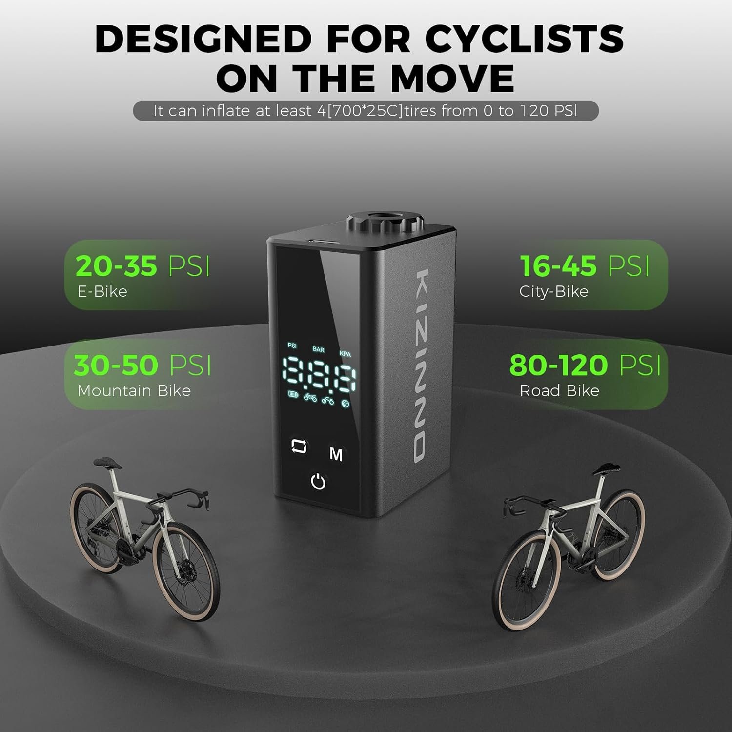 Quick and Efficient:With a robust built-in lithium-ion battery, our portable bike pump inflates your tire from 0 to 120 PSI in just minutes. It fully charges in only 20 minutes with a Type-C USB cable, ready to inflate multiple bike tires on a single charge