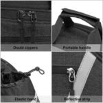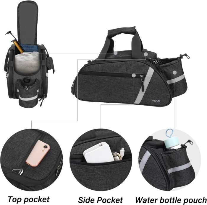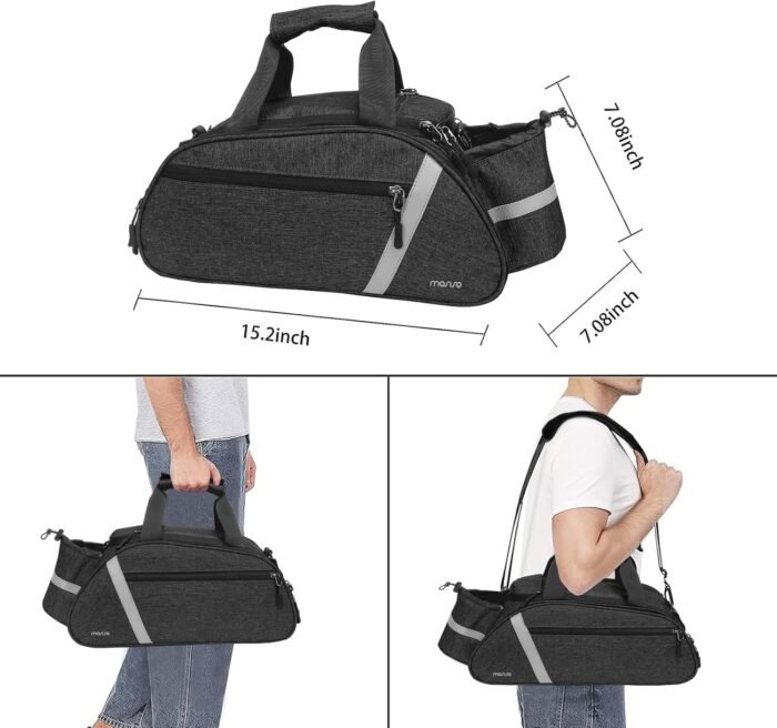 Dimension of this bike bag: 15.2 x 7.08 x 7.08 inch ( L x W x H). 1 main compartment has 12L capacity to keep your clothes and other daily necessities. 3 small multifunctional pockets can store your carry-on items while you’re riding, such as your phone, phone charger, wallet, cable, earphone, power bank, map and so on.