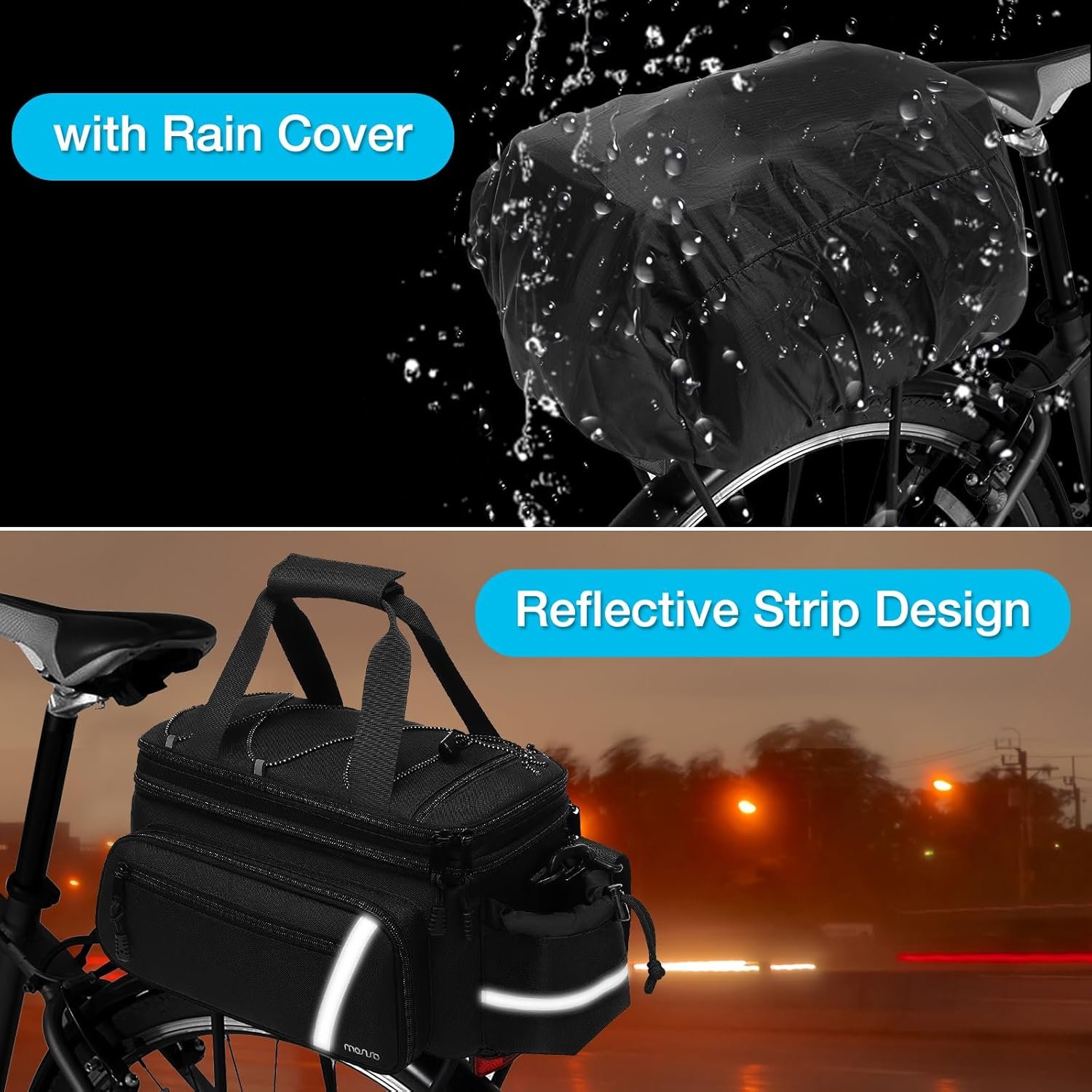 Some reflective strips designed on the bag can increase your night visibility, keep your night ride more safety.