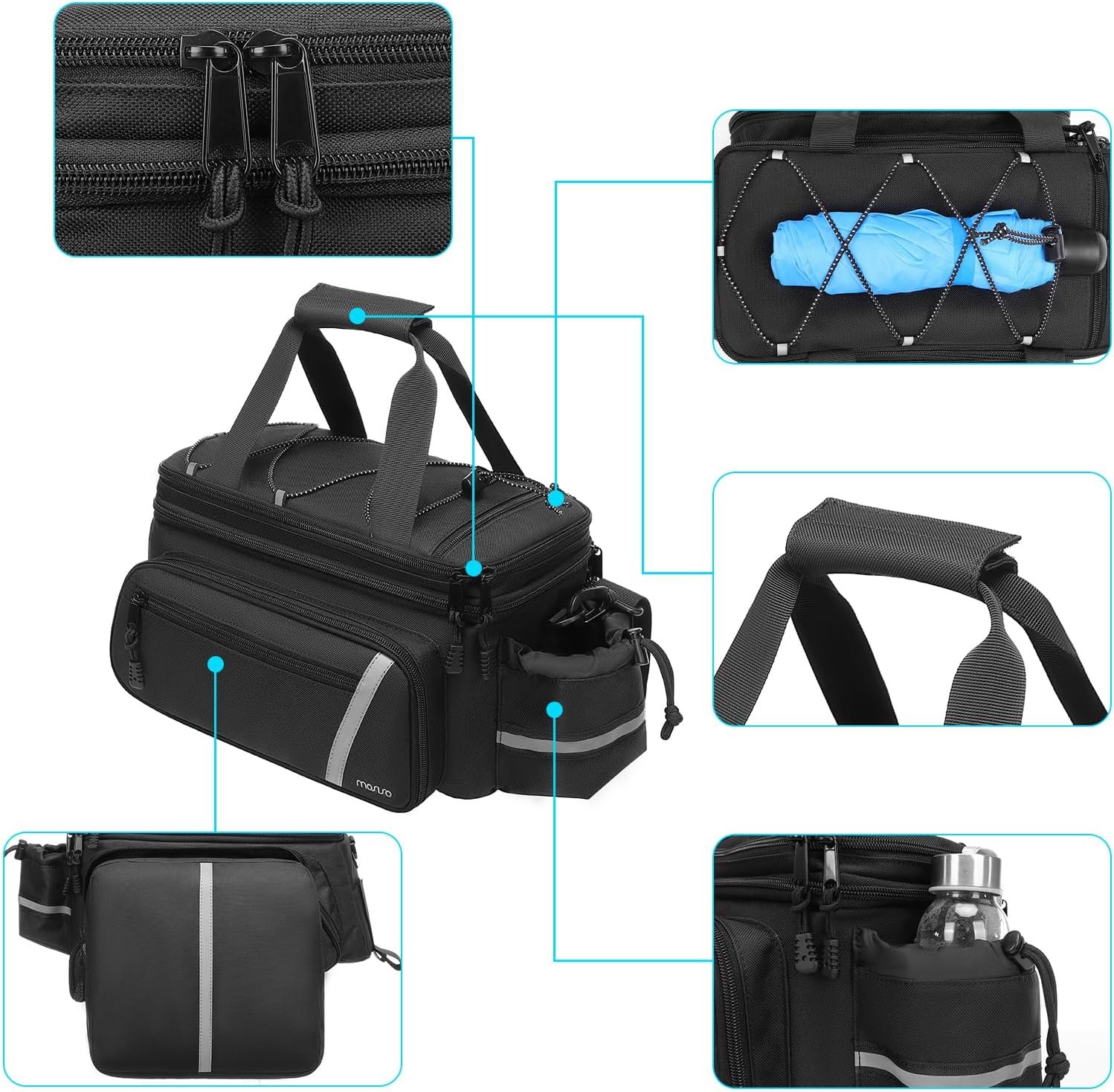 Each side has a foldable pocket of 2.5L capacity to keep your other stuff, such as your clothes, towels and so on. This 2 pockets are wet and dry pockets with waterproof lining, easy for you to access and clean. The elastic cord design at the top provides extra storage space for tools ,towels and other items you need to carry on your ride. A water bottle pouch is designed with elastic band to keep different water bottles or umbrellas (up to largest diameter 2.7 inch).