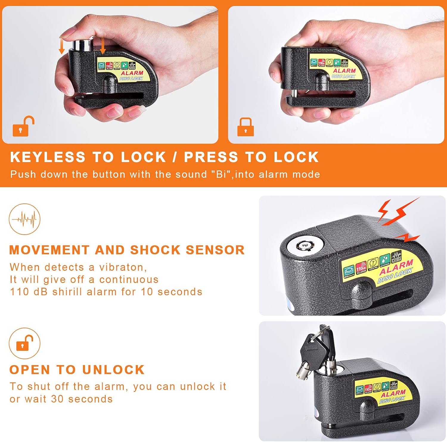 Easy to use: press the alarm lock button to start the locking operation, and 5 seconds later there will be a “beep” to indicate the alarm is activated correctly. To shut off the alarm you will either have use the key to unlock it or wait 30 seconds use the key to unlock the alarm. Our engineers have implanted some special algorithms into the alarm device to solve the error of most other locks Abnormally alarms sounding.