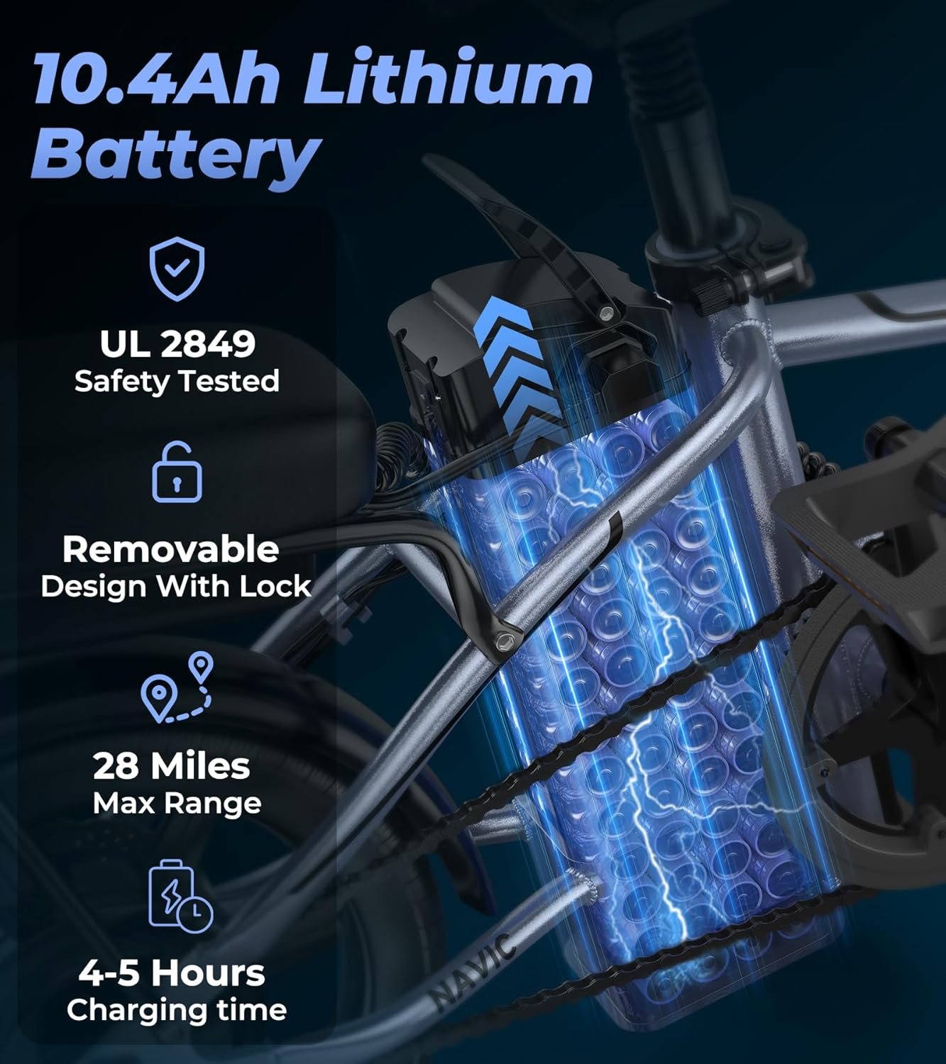 🚴LARGE BATTERY: The CB6 adult electric bicycle, features a 48V, 10.4Ah removable battery, offering a total capacity of 499.2Wh. this electric bike offers a range of 21-28 miles per charge, perfect for Commuting, outdoor sports, off-road riding.