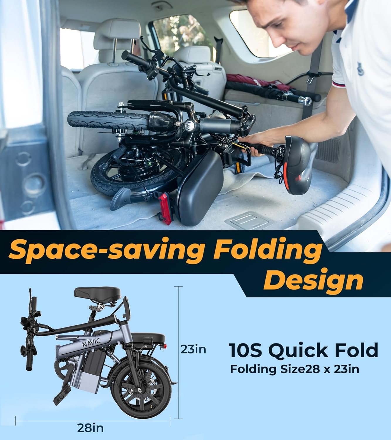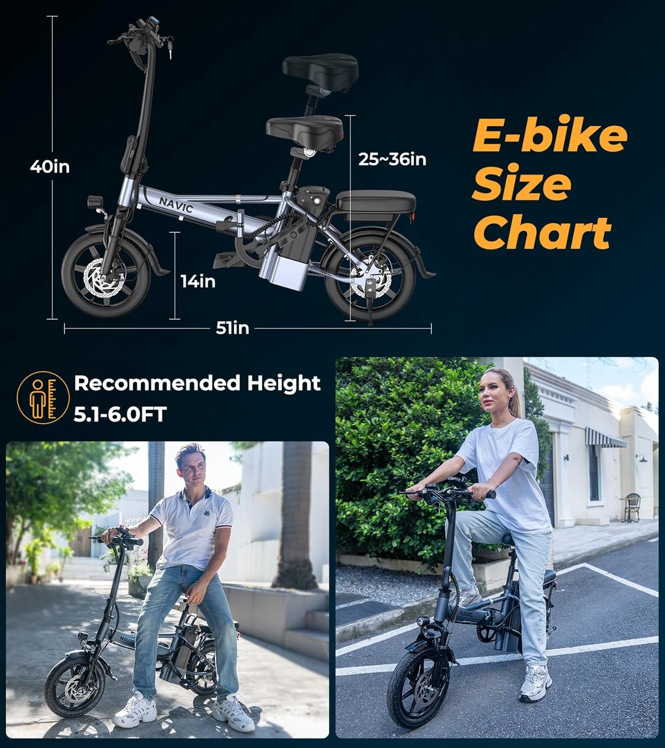 🚴COMFORT & PORTABLE: With quick folding design, you can easily put this CB6 ebike into your car. Ergonomic adjustable seat and charging phone holder bring you a ride for maximum comfort, making every journey enjoyable with CB6 electric bike. Multiple shock absorbers and 14-inch pneumatic tires offer a reliable and adaptable riding experience for any terrain.