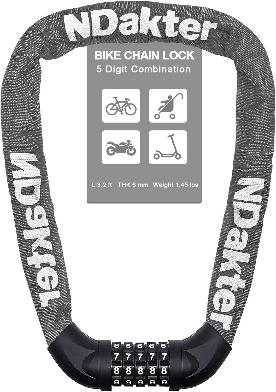 MULTI-PURPOSE: The chain lock is 2.62 feet and weighs about 0.71 pounds, long enough to lock 1-2 bikes together, or lock your bike to a tree, gate, fence, railing, thick pole and others. The lock can also be used for motorcycles, scooters, skateboards, grills, ladders, doors, lawnmowers and many others