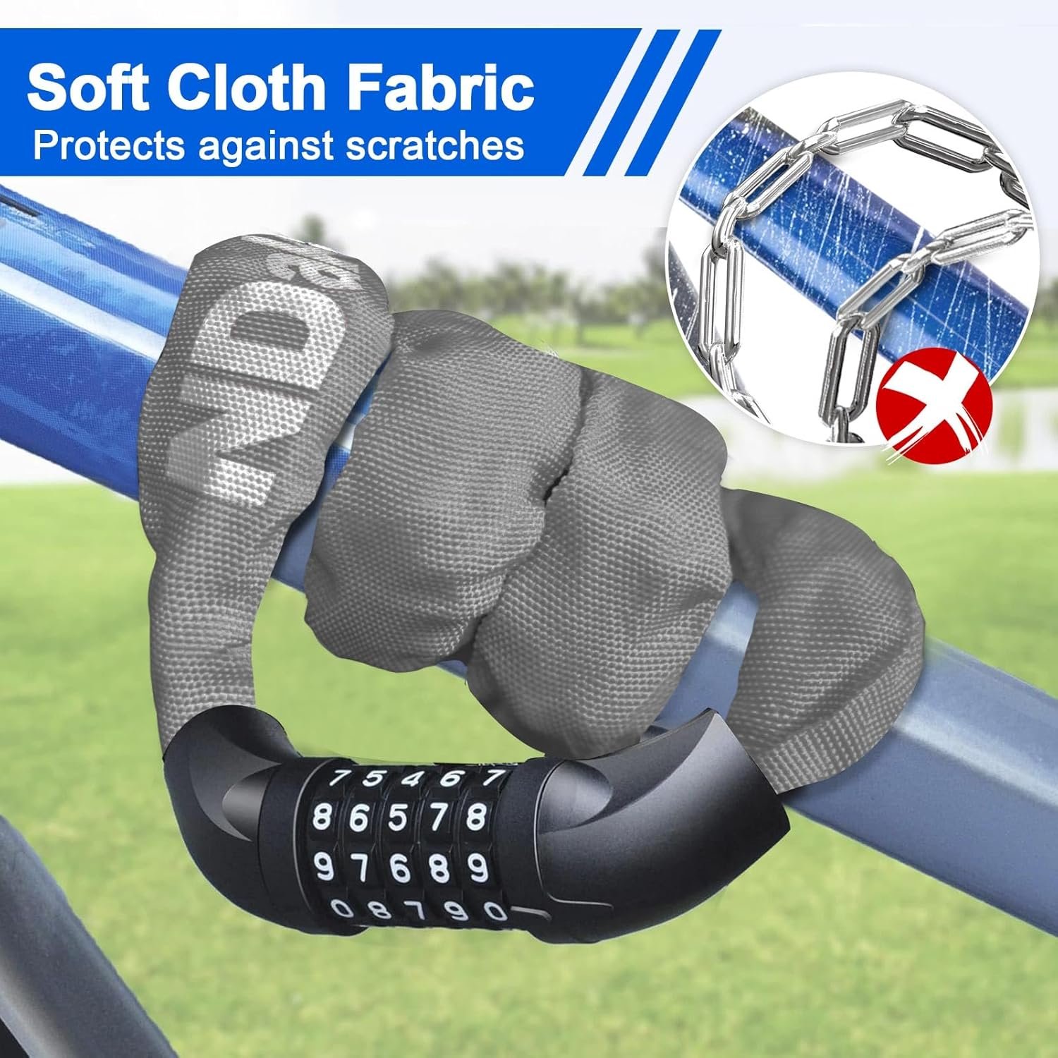 SCRATCH-PROOF FABRIC PROTECTION: The bicycle chain lock is wrapped by a high quality polypropylene fabric, which is scratch-proof and wear-resistant, anti-hot and anti-icing hands; it protects the chain and prevents it scratching your bicycle frame, long lifespan.