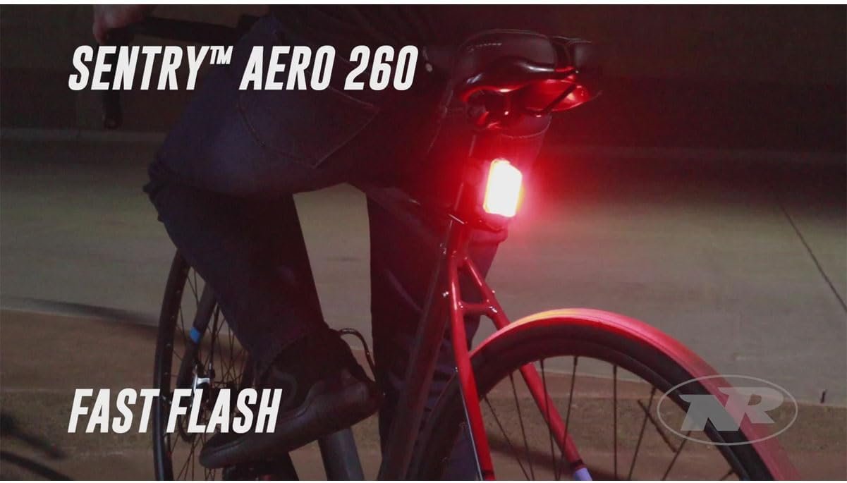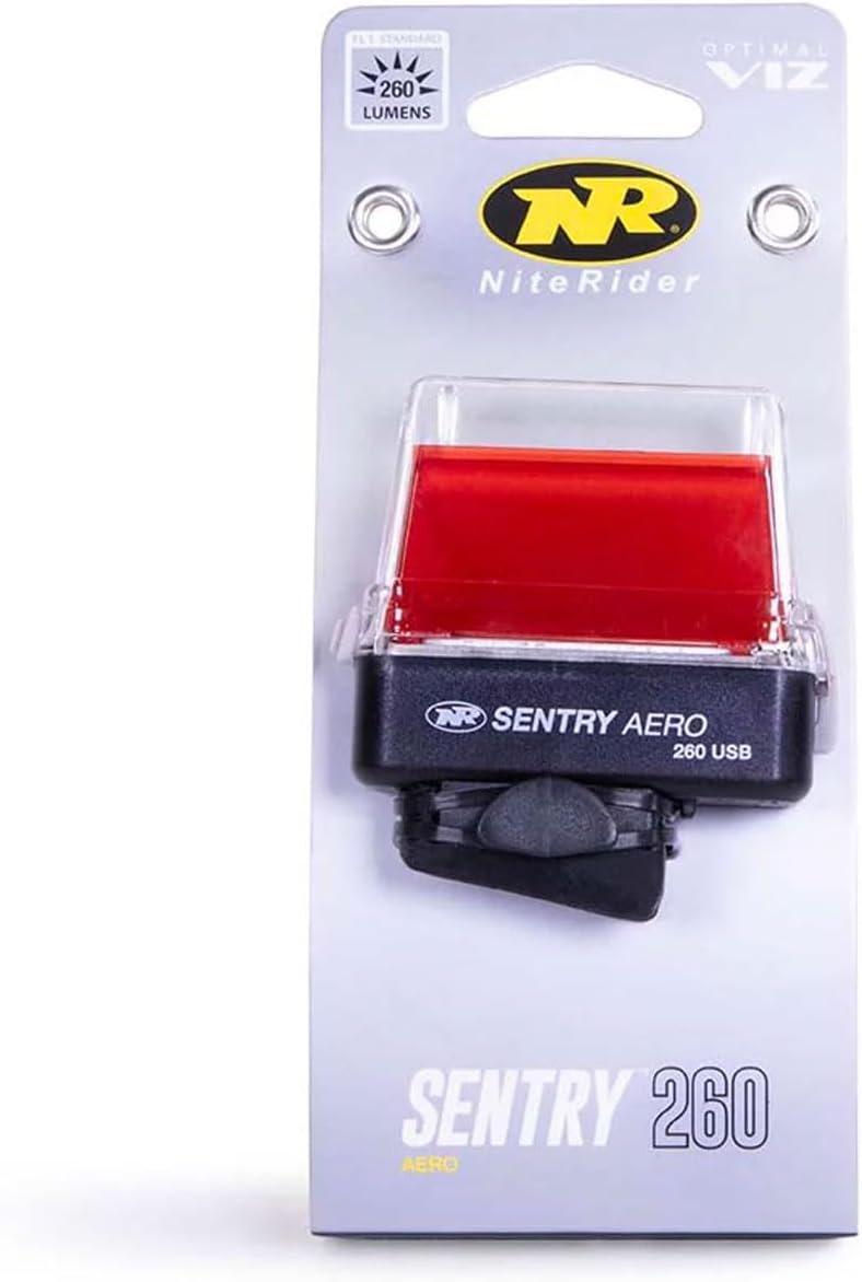 The Nightrider Sentry Aero 260 is a lightweight, aero tail light featuring dual LED light strips to deliver 260 lumens of Daylight Visible red light. An inner and outer lens design helps to shape light output, producing long-range visibility when viewed directly from the rear but also provides ample surrounding light to the peripheral, making the Sentry Aero 260 visible from nearly any angle.