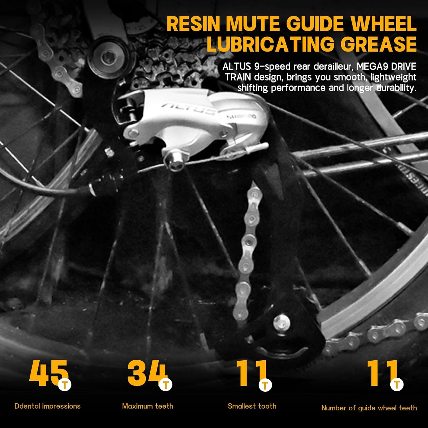 11T upper & lower pulleys ,Total Capacity: 45T. 9 DRIVE TRAIN. Compatible with 9 speed Mountain Bike Road Bike.