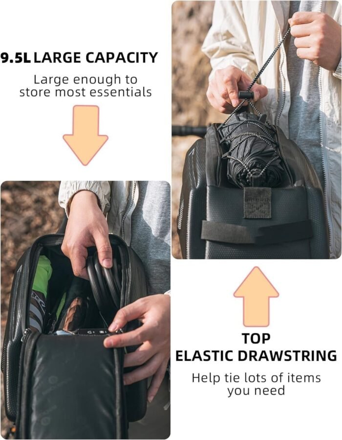 【High-Quality and Fully Waterproof】Experience ultimate durability with our bike rack bag, crafted from reinforced hard shell polyester coated with PU. It’s not only lightweight and easy to clean but also fully waterproof, ensuring your equipment stays dry even in the rain. Plus, it includes a rain cover for added protection.