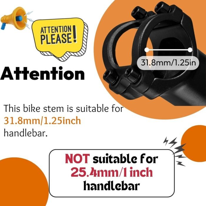 𝑺𝒊𝒛𝒆- Handlebar Diameter: 31.8mm(1.25”), Fork Tube Diameter: 28.6mm, Length: 110mm, Rise Angle: 35 Degree. Rmiott 35-degree bike handlebar stem gives you a just-right connection for ultimate control. Before you make a move, take a moment to double-check the handlebar and fork sizes. We want you to ride with confidence, and that starts with getting the size spot-on.