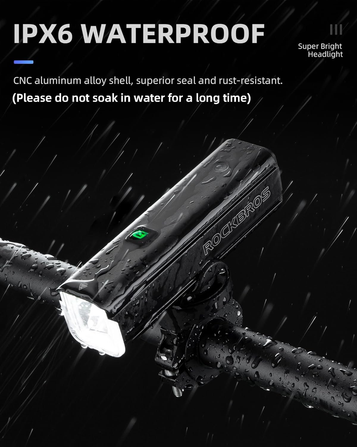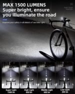Super Bright 1500 Lumens: ROCKBROS bike light uses premium quality LED, max 1500 lumens super bright light. 90° wide light brightens, unique 20pcs lens, not dazzling, 1.2 meter anti-falling ability, smart temperature protection, ensure you illuminate the road in all details of our bike light.
